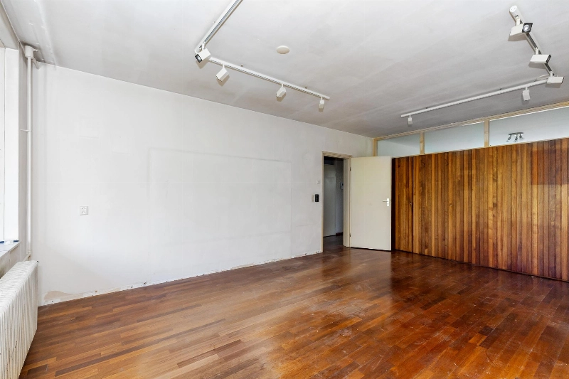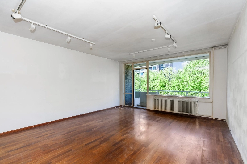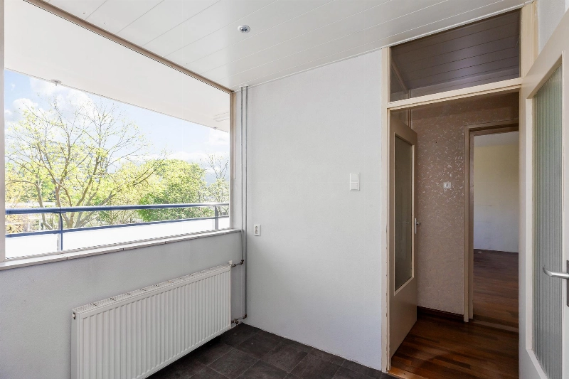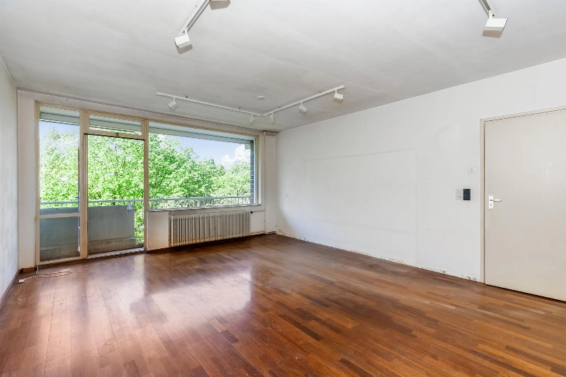 Mooie ruime woonkamer met ingebouwde kast en een parketvloer. Via de woonkamer bereikt u het zonnige balkon. Deze is gelegen op het westen en geeft dat mooie uitzicht over het groen van “Broekpolder”! Voor de zonnige dagen kunt u gebruik maken van het recent geplaatste elektrisch zonnescherm (2024).