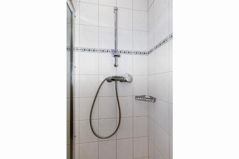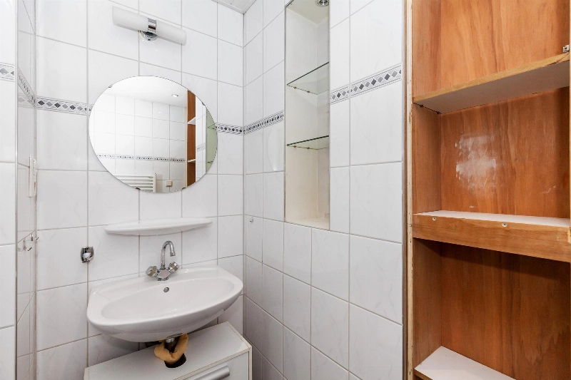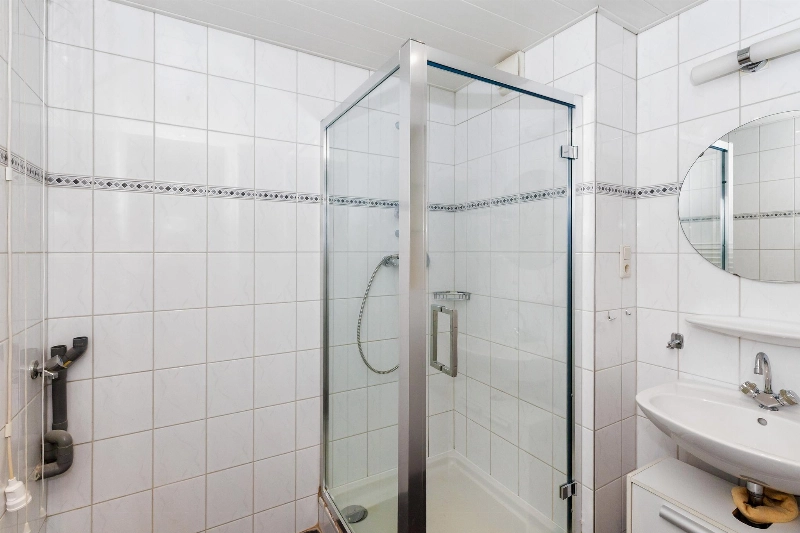 De badkamer is betegeld in een lichte kleurstelling en voorzien van een doucheopstelling, een wastafel, radiator en opstelplaats voor de wasmachine en droger.