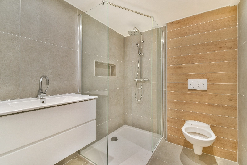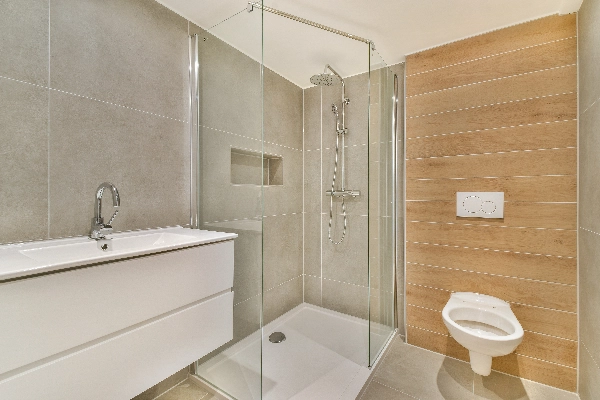 Moderne en stijlvol afgewerkte badkamer met grijze wand- en vloer tegels in combinatie met houtlooktegels, een ruime inloopdouche, een zwevend toilet, een elektrische verwarming en een wastafelmeubel met lades.