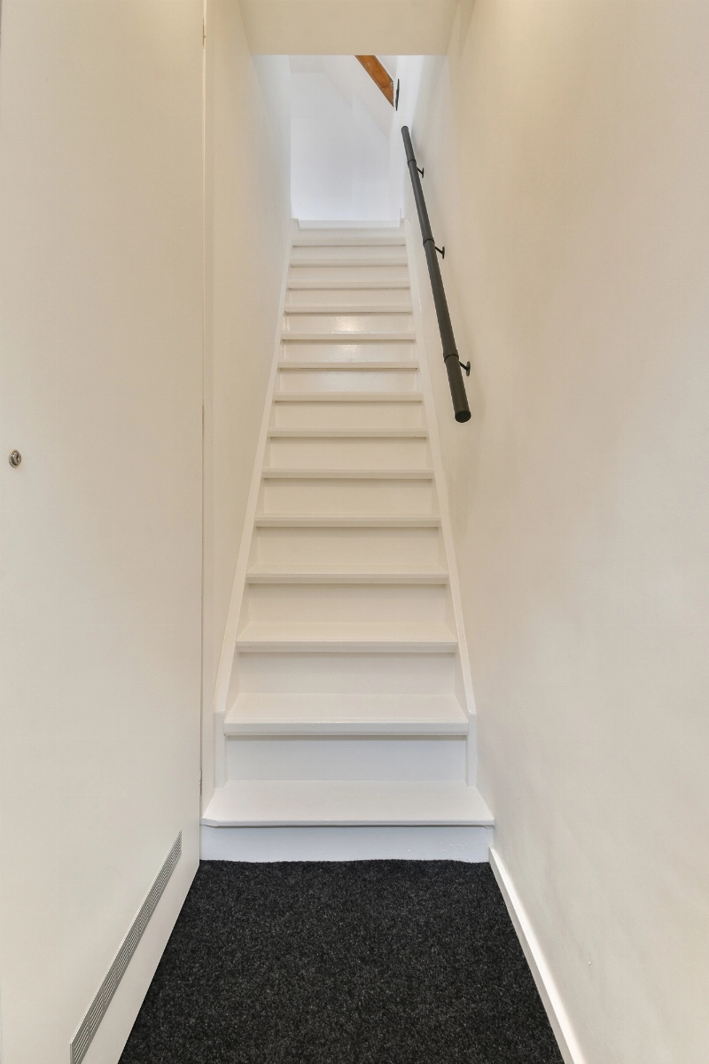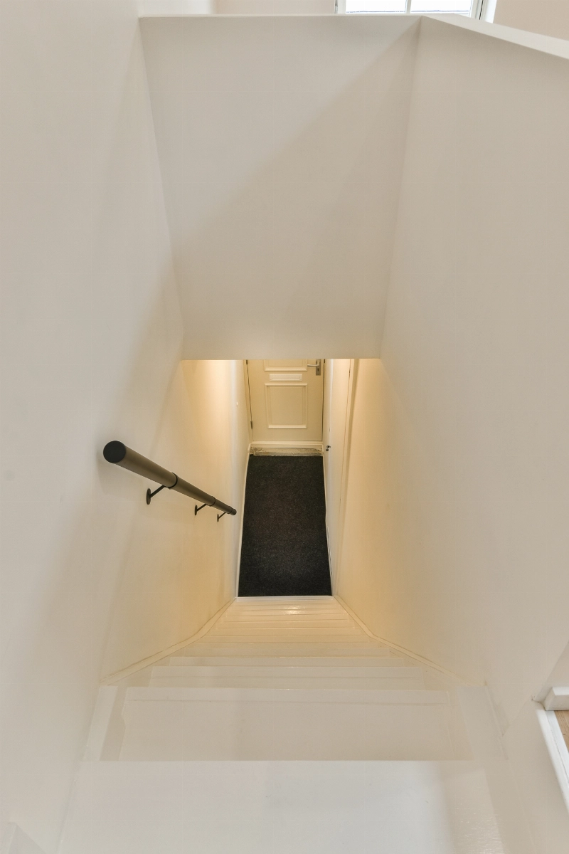 Entree, trapopgang met nieuwe meterkast (11 groepen, 3x aardlekschakelaar en hoofdschakelaar) en trap naar de eerste verdieping. Prachtige lichte woonkamer met een indrukwekkend plafond van 4,5 meter hoog, voorzien van een dakraam en zichtbare dakspanten. De fraaie ramen met glasverdeling in de voorgevel zorgen voor een warme, karaktervolle sfeer.
