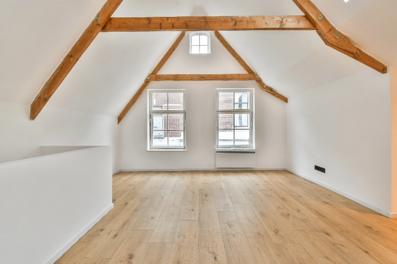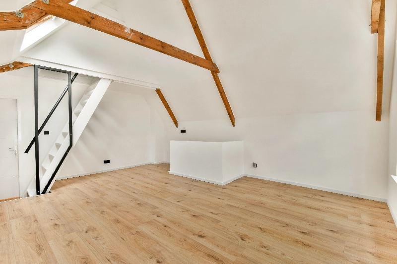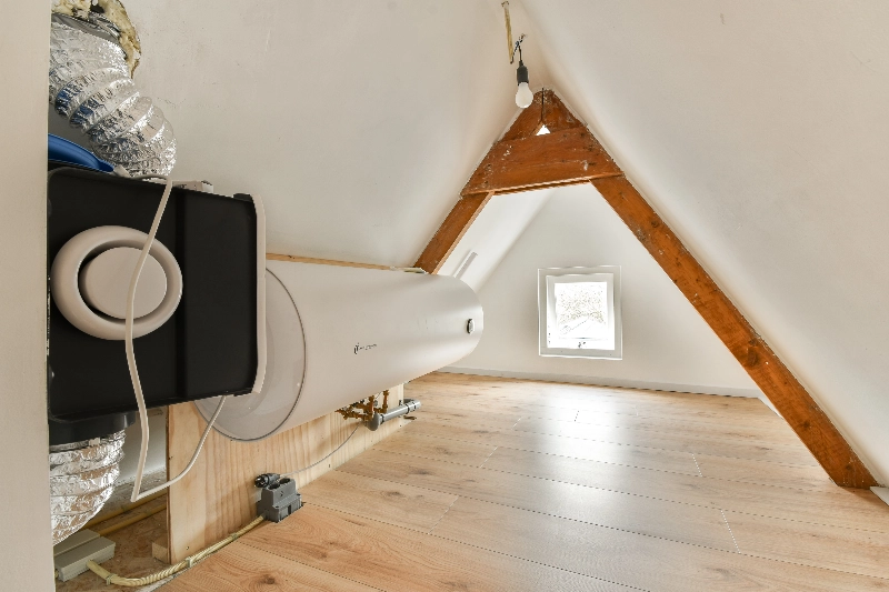 Op de vliering bevindt zich de elektrische boiler (150 l.), de unit van de mechanische ventilatie en de aansluiting voor de wasmachine (deze kan eventueel ook geplaatst worden in de slaapkamer aan de voorzijde).