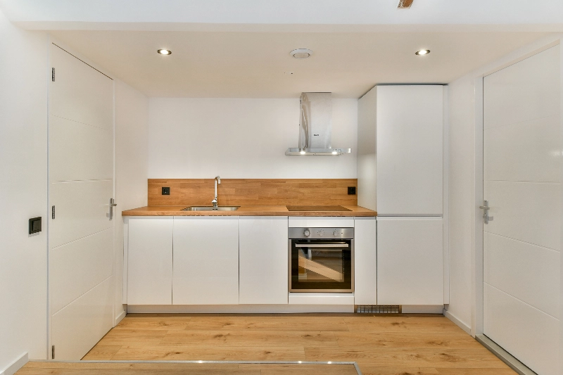 Moderne open keuken uitgevoerd in het hoogglans wit met een stijlvol houtlook aanrechtblad. De keuken is uitgerust met een inductiekookplaat, RVS afzuigkap, oven, koelkast, vriezer en een vaatwasser. Alles wat je nodig hebt om direct te kunnen koken!