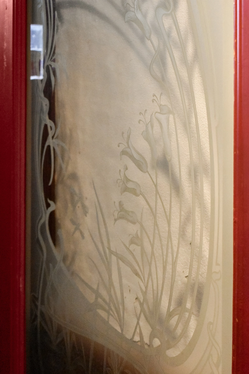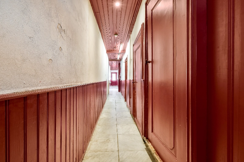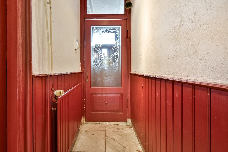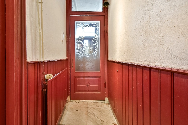 Achter het sierlijke hekwerk aan de straatzijde bevinden zich twee toegangsdeuren. Eén deur geeft toegang tot de winkelruimte aan de voorzijde en de tweede voordeur leidt naar een diepe gang met trapopgang naar de bovenwoning.