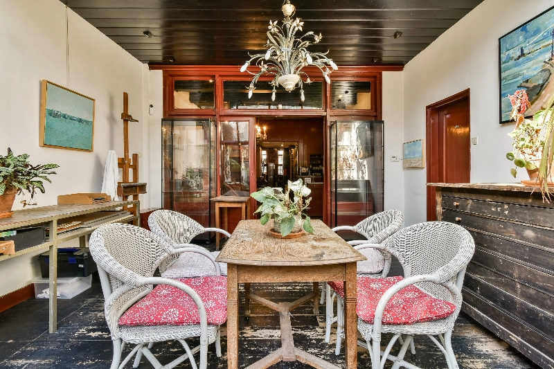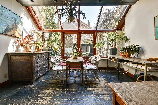 Via een doorgang bereikt u de achtergelegen woonkamer met serre, die sinds de jaren ’80 werd gebruikt als tearoom. Een bijzonder detail zijn de originele beschilderde balken uit de 15e eeuw, die deze ruimte een uniek historisch karakter geven. In de serre zorgen dubbele openslaande deuren voor een directe verbinding met de achtertuin.