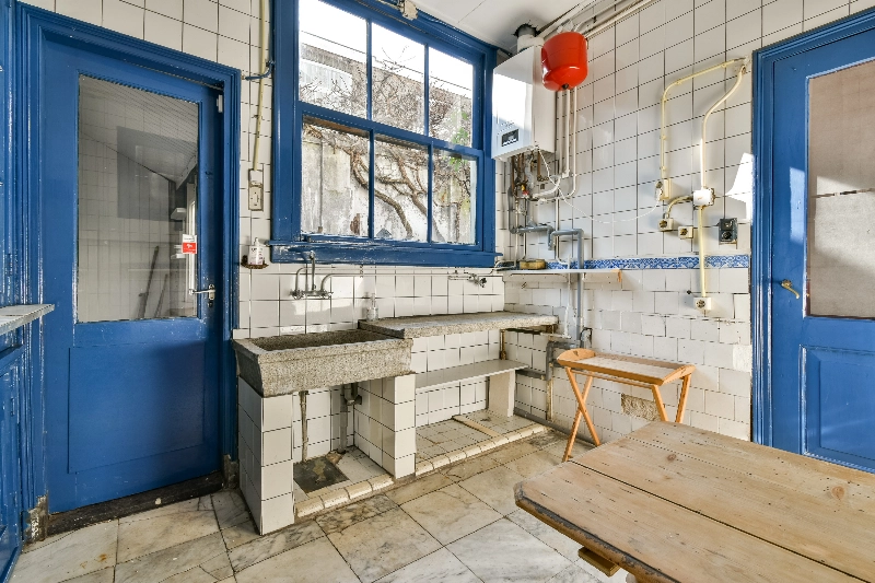 Vanuit de tearoom loopt u via een diepe gang naar een separate toiletruimte en een keuken met granito-opstelling. Vanuit de keuken is er toegang tot een praktische achtergelegen berging.