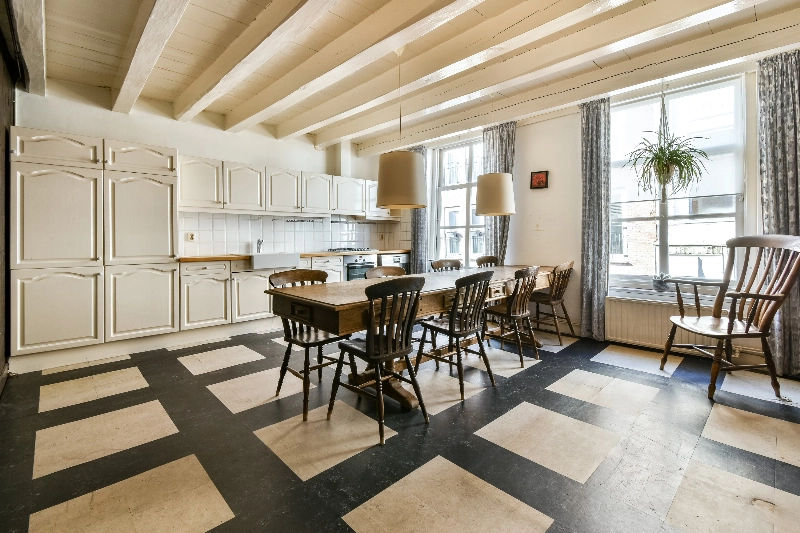 Aan de voorzijde bevindt zich de ruime woonkeuken, met een lange keukenopstelling en een originele bedstede. De ruimte biedt volop mogelijkheden voor een eigentijdse woonkeuken met een grote eettafel waar familie en vrienden samen kunnen komen.