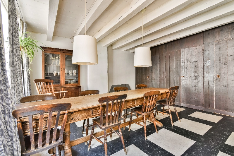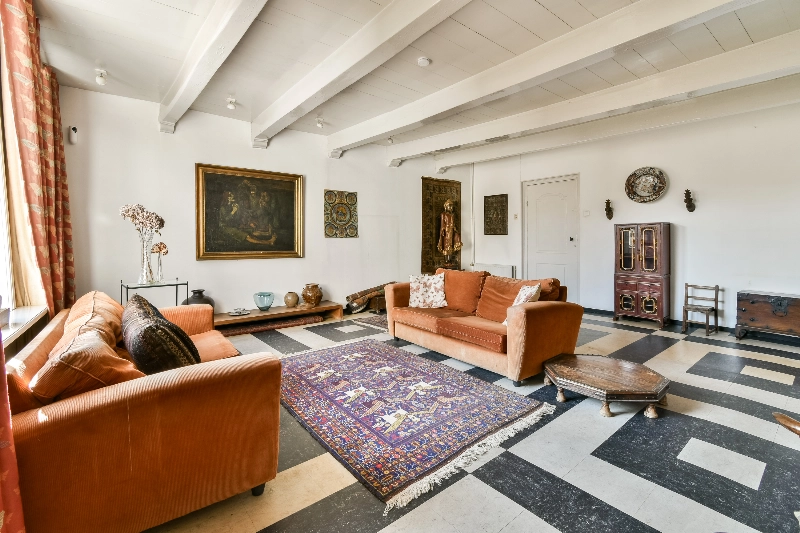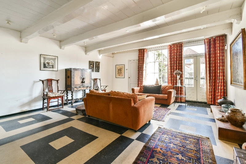 Aan de achterzijde ligt de woonkamer, waar de zichtbare spanten bijdragen aan een warme en karaktervolle sfeer. Via dubbele deuren heeft u toegang tot een balkon.