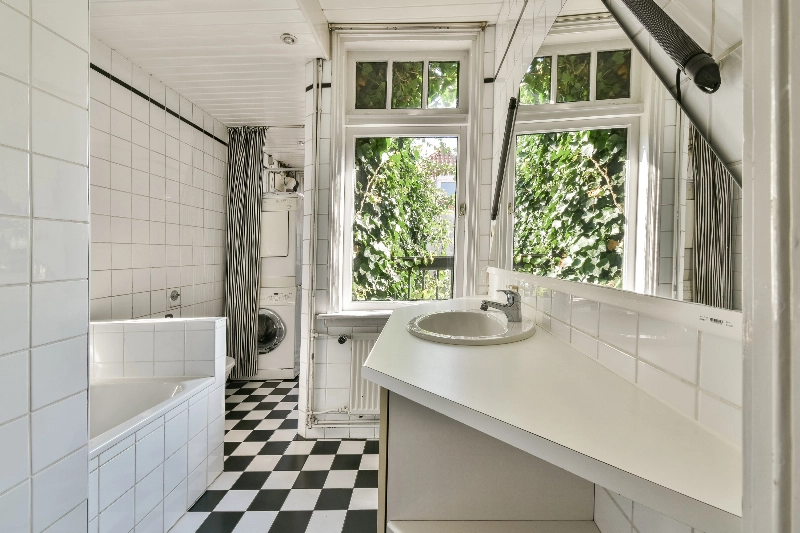 Achter de woonkamer bevindt zich de badkamer, gedeeltelijk betegeld en voorzien van een wastafelmeubel, ligbad met doucheopstelling, tweede toilet en aansluitingen voor wasmachine en droger. Ook bevindt zich hier de opstelplaats van de cv-ketel. Vanuit deze ruimte is het dak bereikbaar; het bitumen dak is recent vernieuwd.