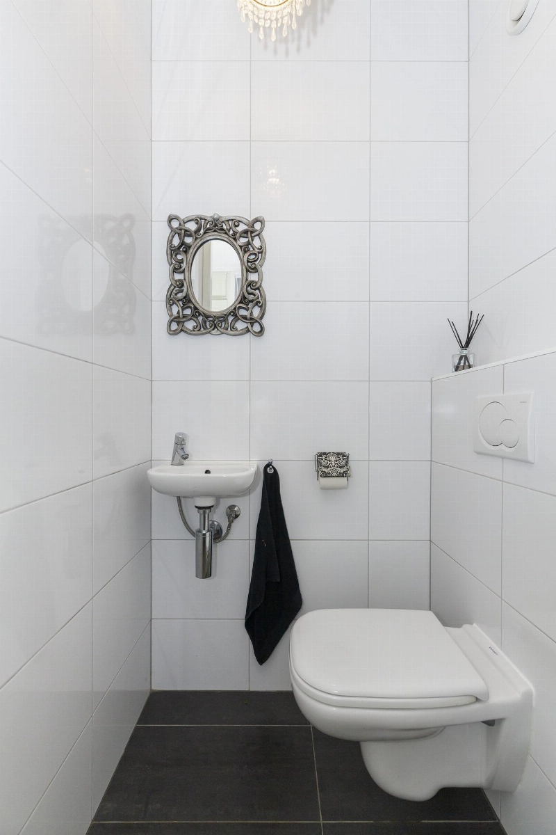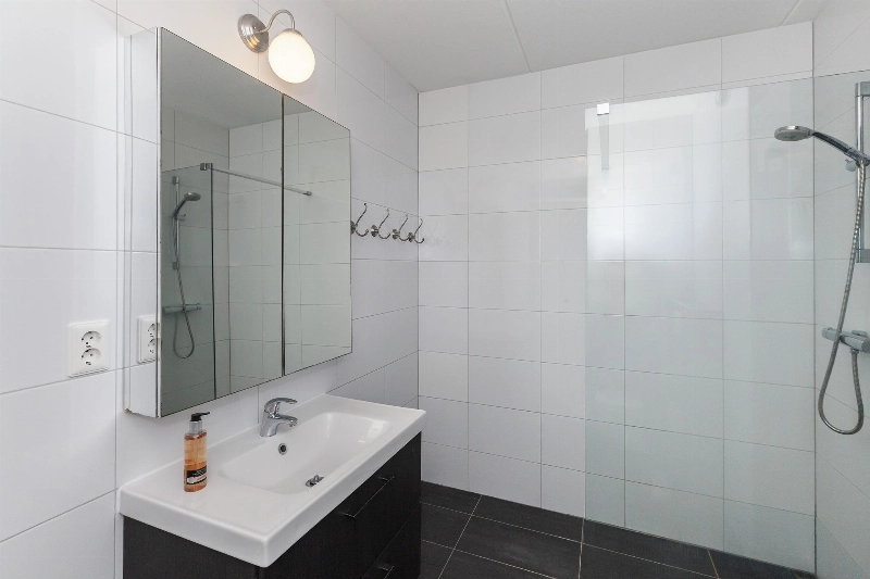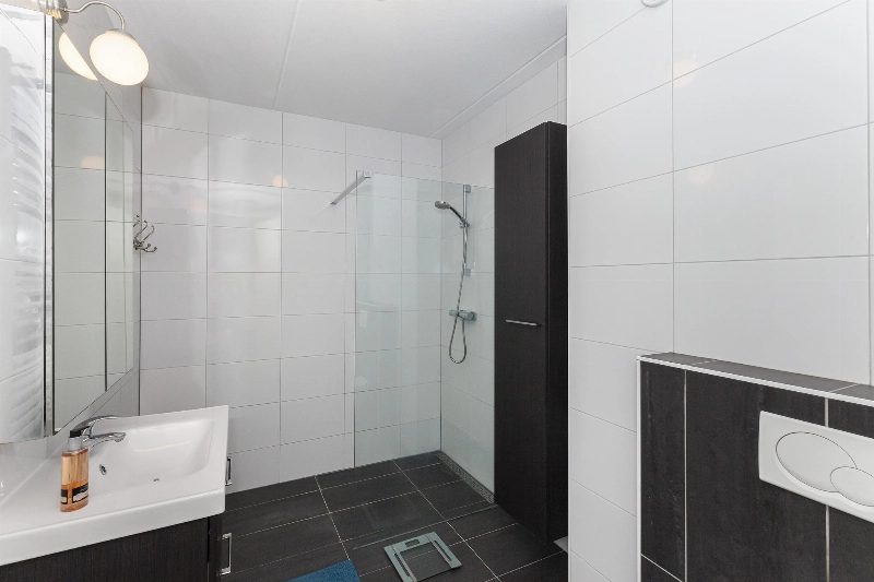 De badkamer van deze woning is zeer ruim te noemen! Deze is geheel betegeld en voorzien van een wastafelmeubel met spiegel, een inloopdouche en een 2e toilet.