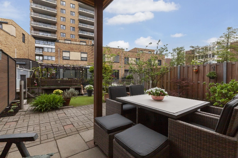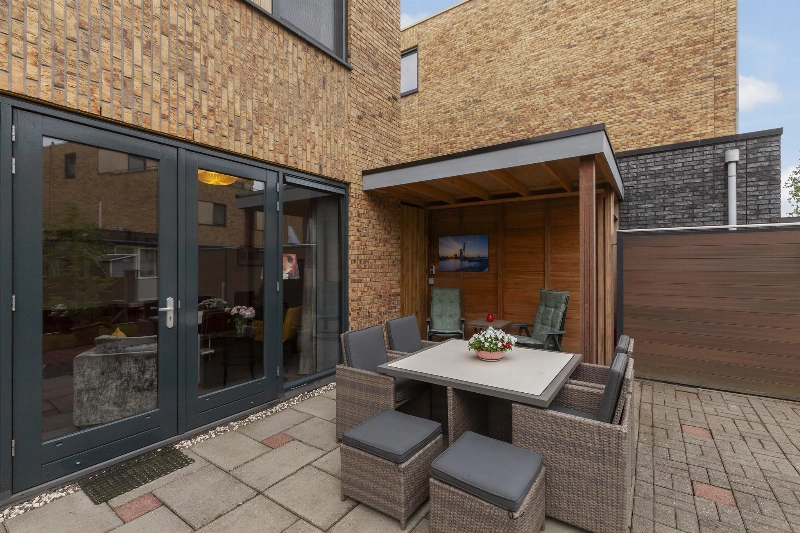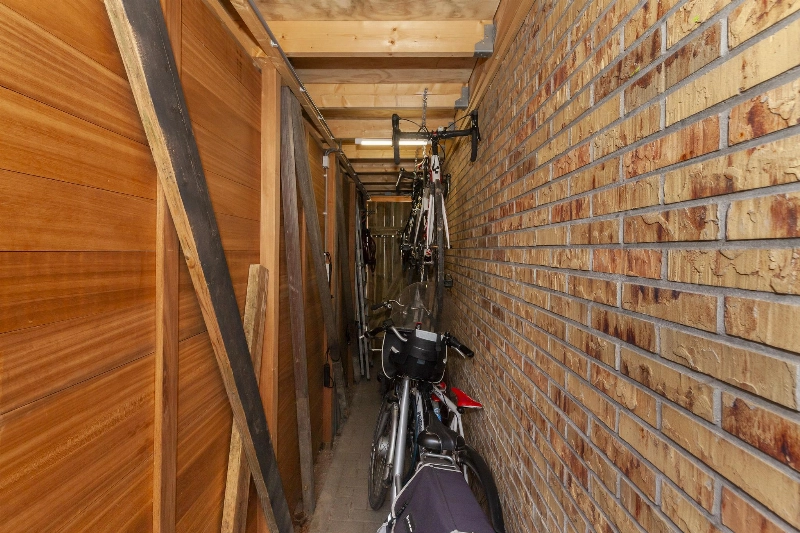 Via de twee openslaande deuren bereik je de tuin. Deze is voorzien van bestrating, groen en de steeg naast de woning is overkapt. Dit geeft niet alleen een leuk effect maar geeft ook nog wat extra bergruimte! Deze overkapping is extra voorzien van verlichting en een WCD, handig voor het opladen van de elektrische fiets! De overkapping loopt deels door in de tuin.