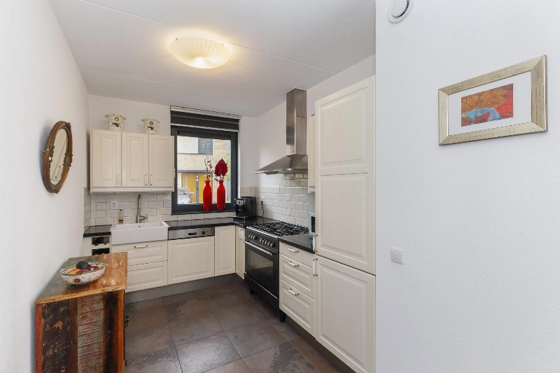 De open keuken ligt aan de voorzijde van de woning. Deze is uitgevoerd met een crèmekleurige hoekopstelling en voorzien van een koelkast, vriezer, afzuigkap, 5 pits gaskookplaat, brede oven, vaatwasser en een porseleinen wasbak. Het werkblad is van composiet en de achterwand is afgewerkt met betegeling.