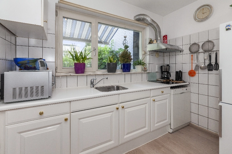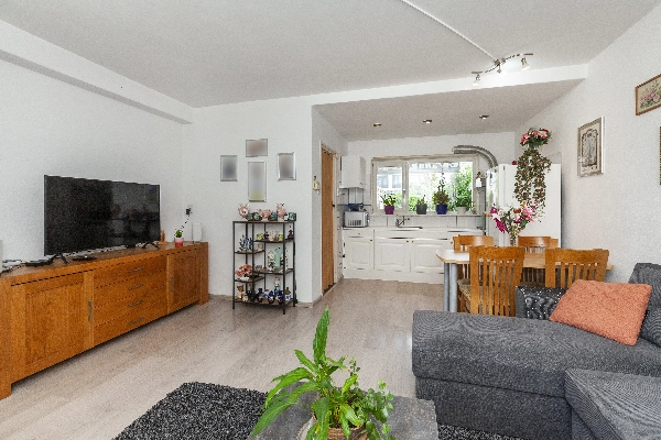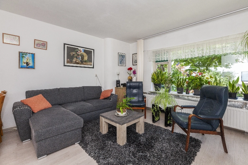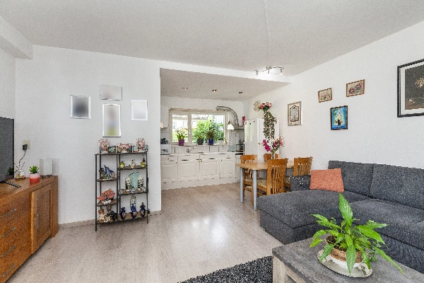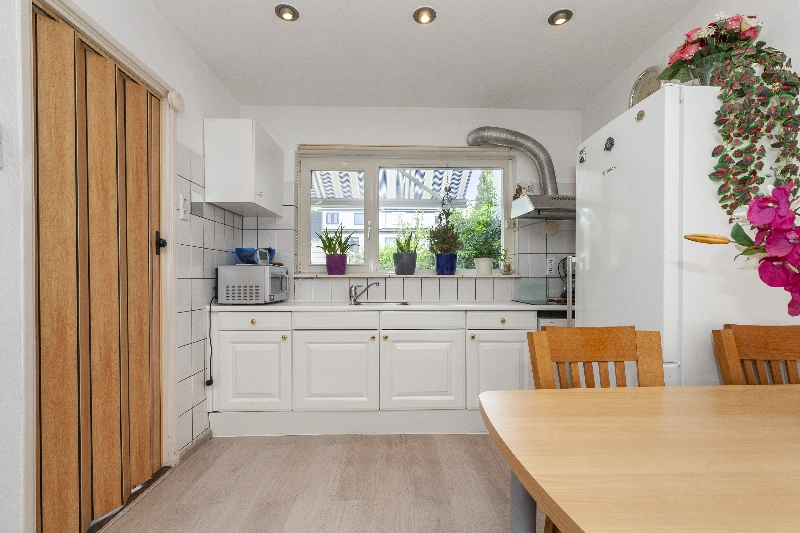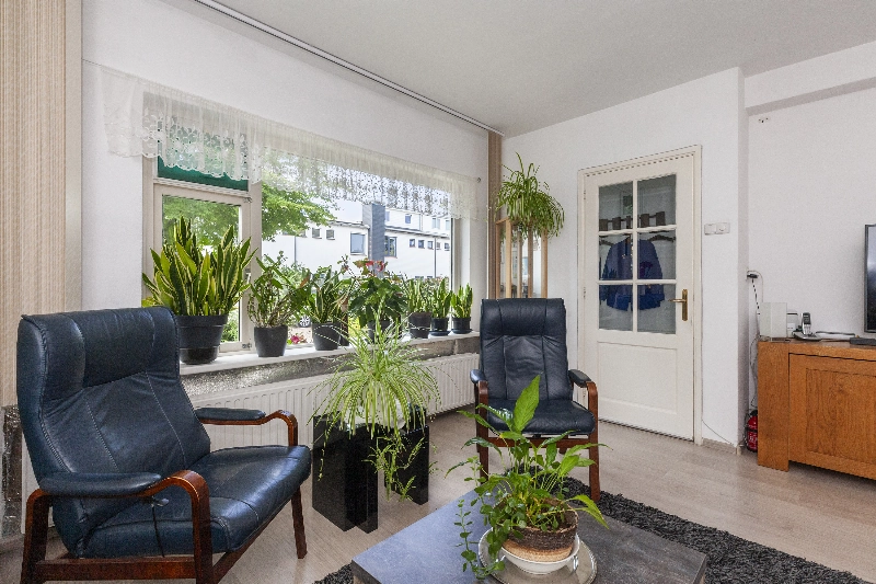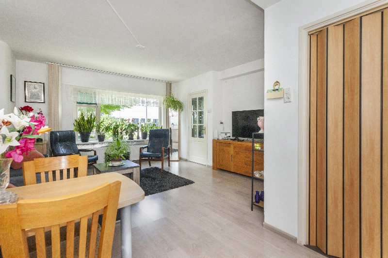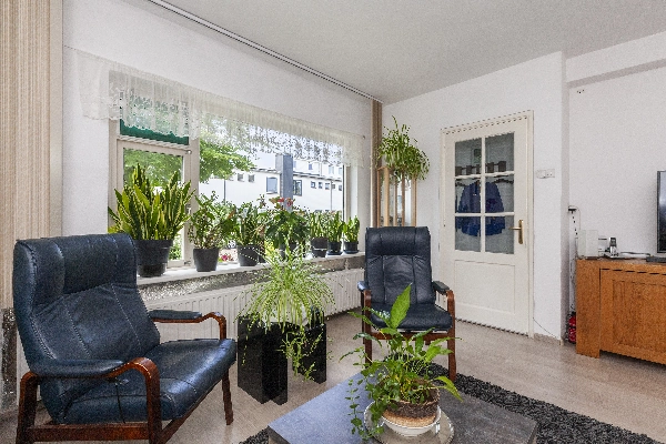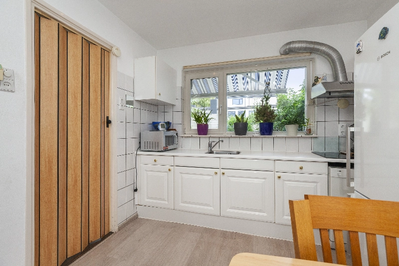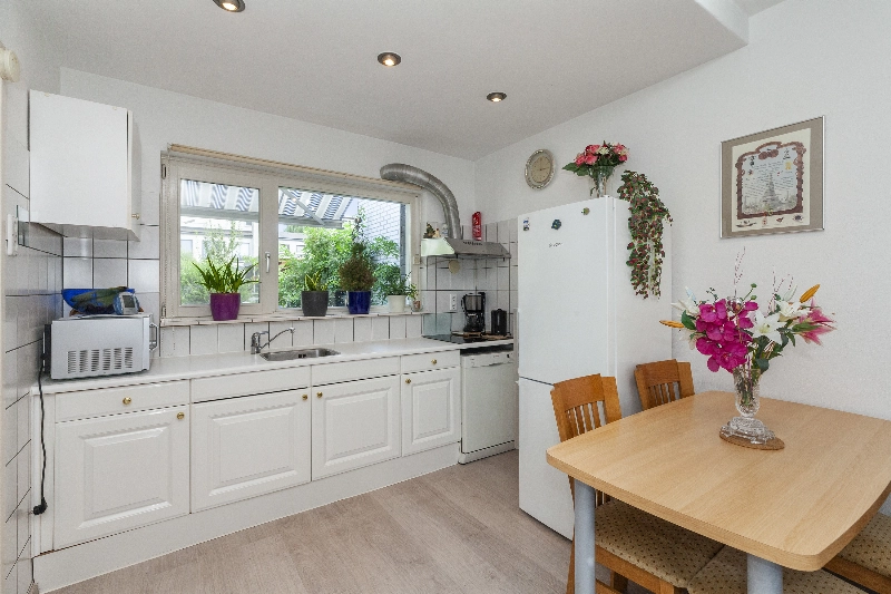 Entree via de diepe voortuin met veel groen wat zorgt voor verkoeling op warme zomerse dagen, voordeur, hal met bergkast en deur naar de ruime woonkamer. De woonkamer heeft een mooi lichtinval en een open keuken, welke is voorzien van witte fronten en kunststof aanrechtblad, 4 pits elektrische kookplaat, afzuigkap.