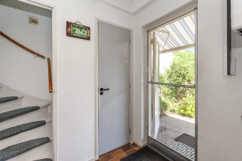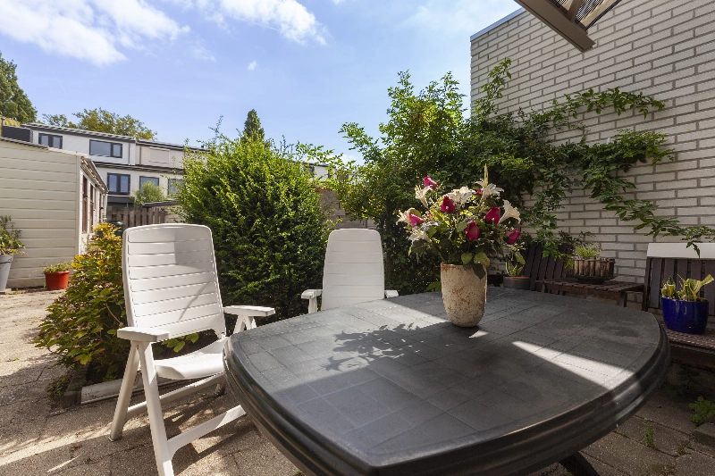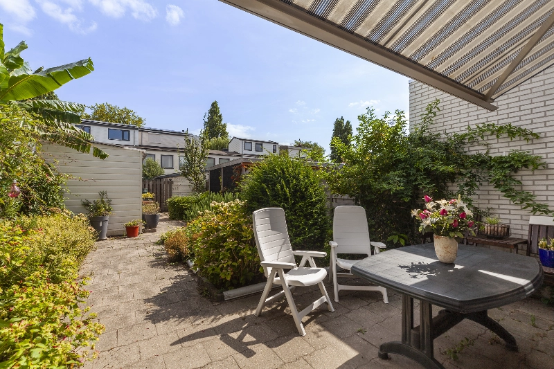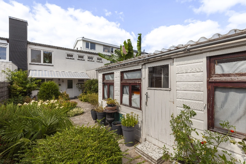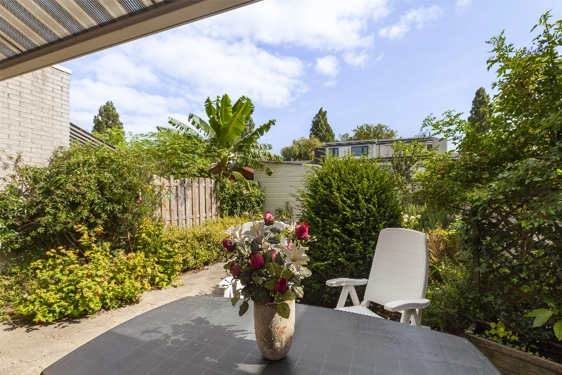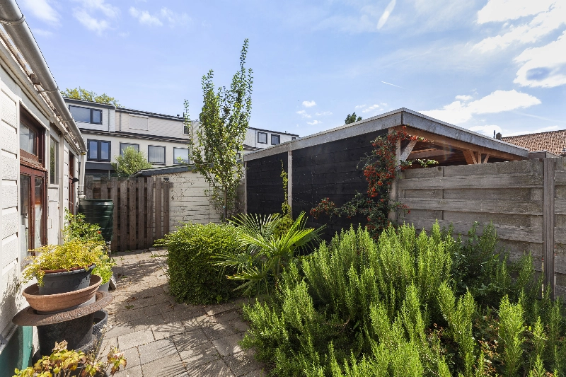 Via de keuken bereik je een ruime tussenhal/bijkeuken met toiletruimte, opstelling van de CV-ketel (2019) en toegang de tuin. Wat een diepe tuin! Met veel groen, zo staat achterin de tuin een perzikboom en is er ook een grote rozemarijn struik, tevens is er een fijne plek om je tuinstel of loungeset neer te zetten. Achterin vind je een houten berging welke wel aandacht nodig heeft en er is een achterom voor de fiets aanwezig. Het zonnescherm geeft schaduw voor de zonnige dagen.