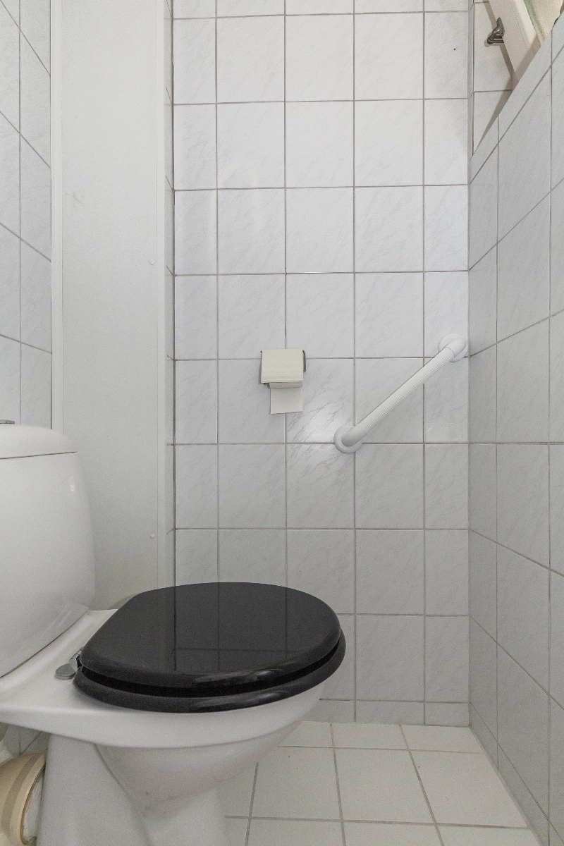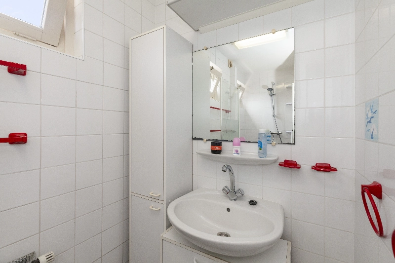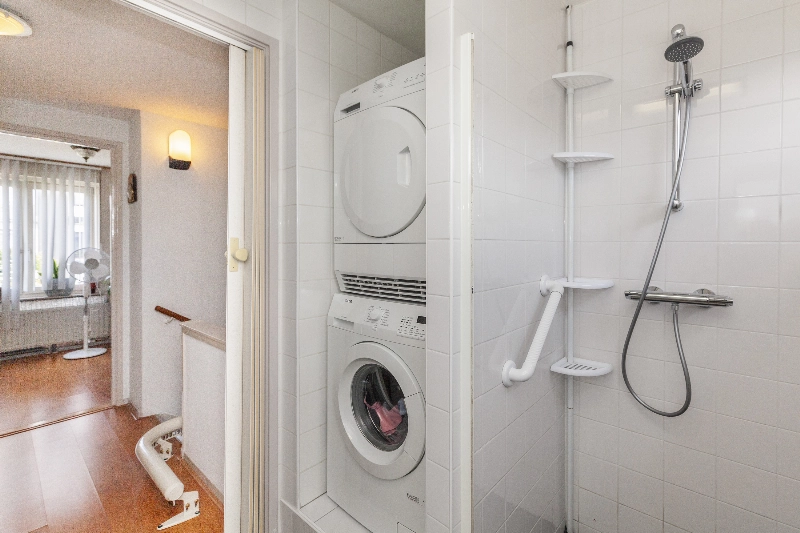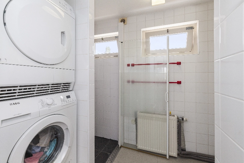 De badkamer is geheel betegeld en voorzien van een douchehoek, wastafelmeubel en opstelplaats voor de wasmachine én droger.
