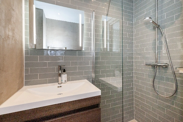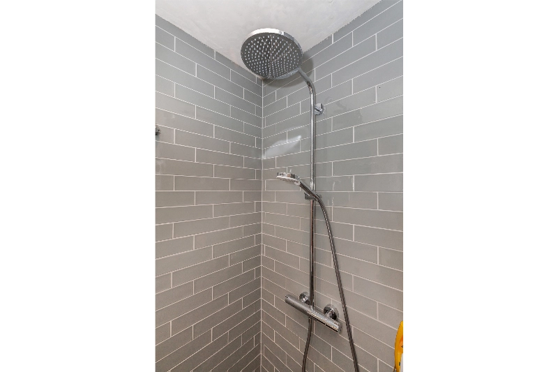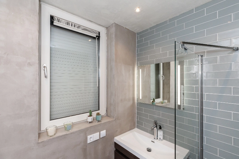 En dan de badkamer, deze is zoals de rest van het appartement schitterend. Zo zijn de wanden van de inloopdouche betegeld met een moderne tegel en de overige muren zijn voorzien van beton cire. Naast de inloopdouche is het wastafelmeubel met spiegel.