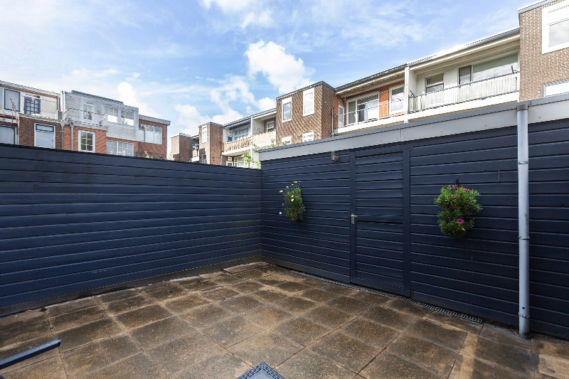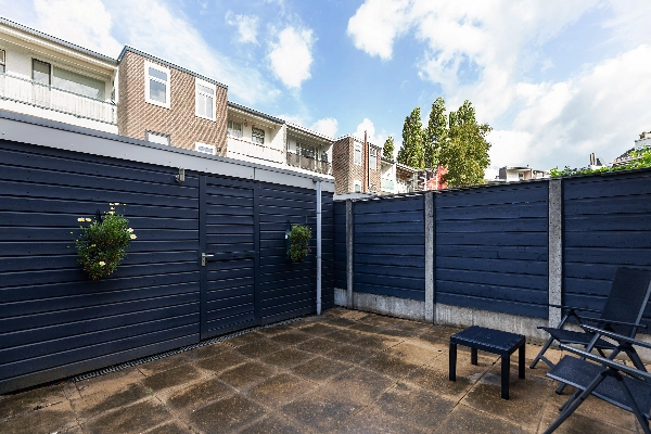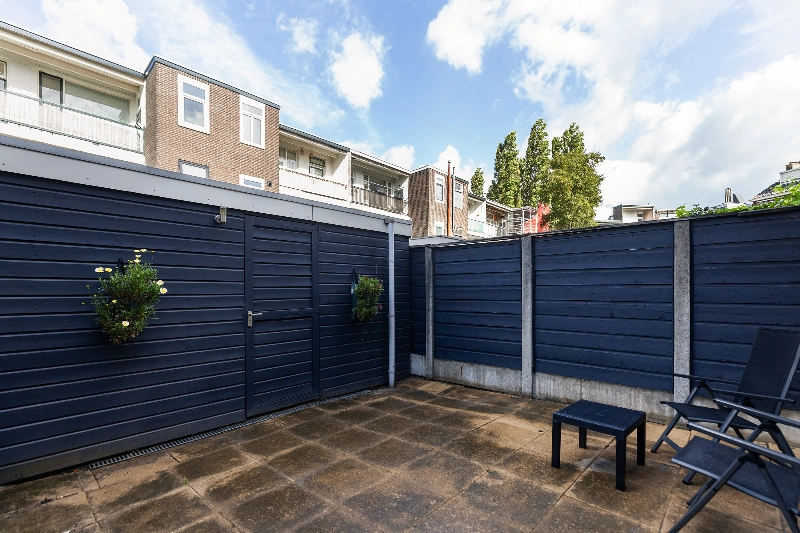 De tuin is gesitueerd op het noordwesten, is perfect voor een avondje barbecueën of een zomerse borrel. Bovendien biedt de tuin een achterom en heb je de beschikking over een houten berging met elektra.