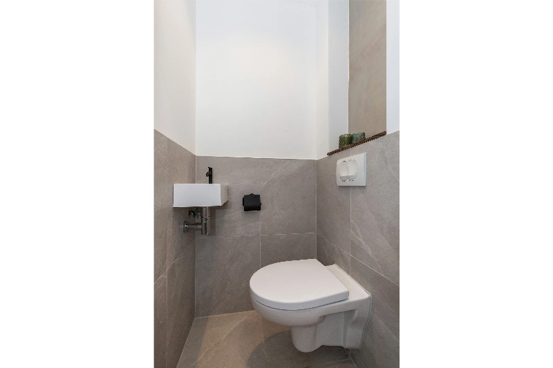 Vanuit de hal de verschillende ruimtes, zoals de inpandige berging met opstelling van de wasmachine en meterkast, toiletruimte met zwevend closet, fonteintje, grijze vloer- en wandtegel en aan het einde van de hal loop je de woonkamer binnen.