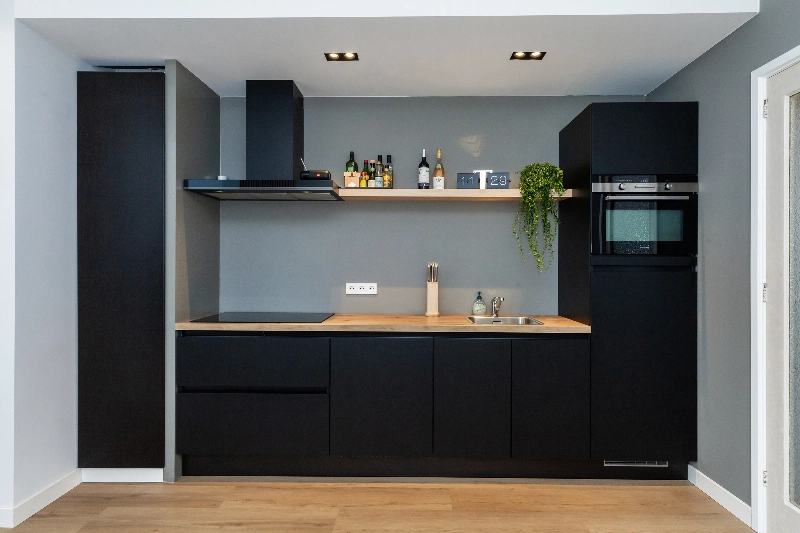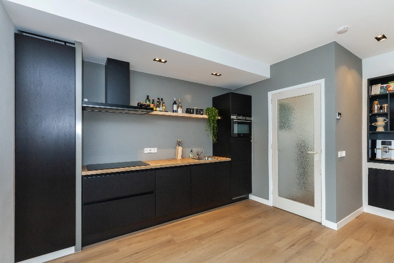 De open keuken (2022) met zwarte fronten en houten details is een plaatje om te zien en is voorzien van een vaatwasser, inductie kooplaat, zwarte afzuigkap, combimagnetron en inbouwkoelkast.