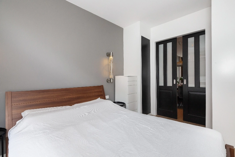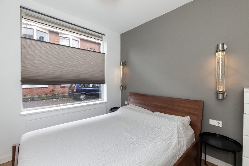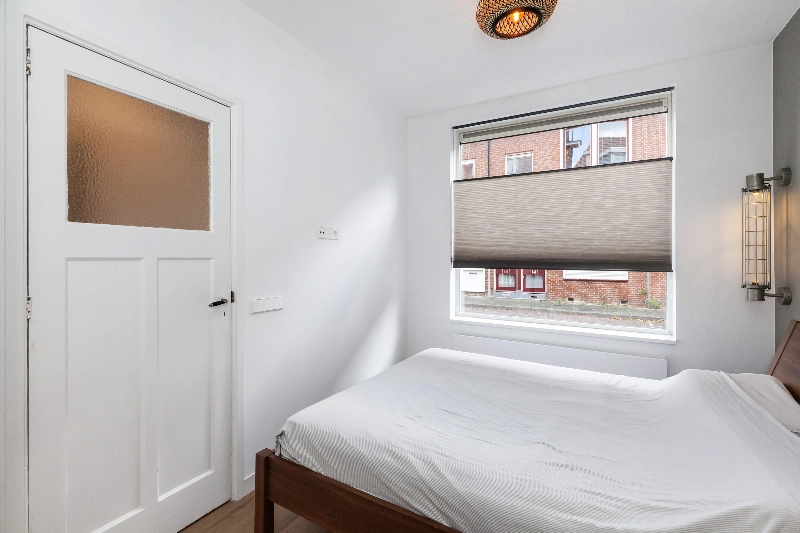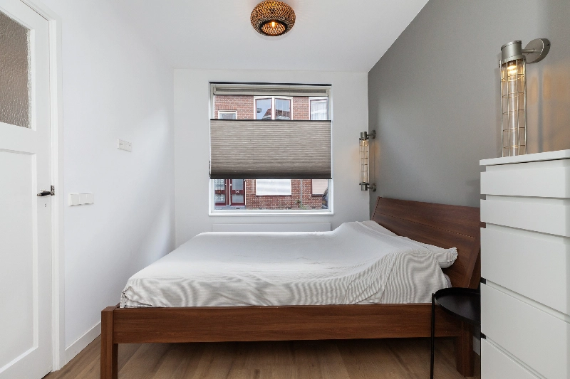 Vanuit de woonkamer loop je via de en suite deuren, met aan weerszijde inbouwkasten, de slaapkamer binnen. De slaapkamer is gelegen aan de voorzijde van het appartement en tevens bereikbaar vanuit de hal.