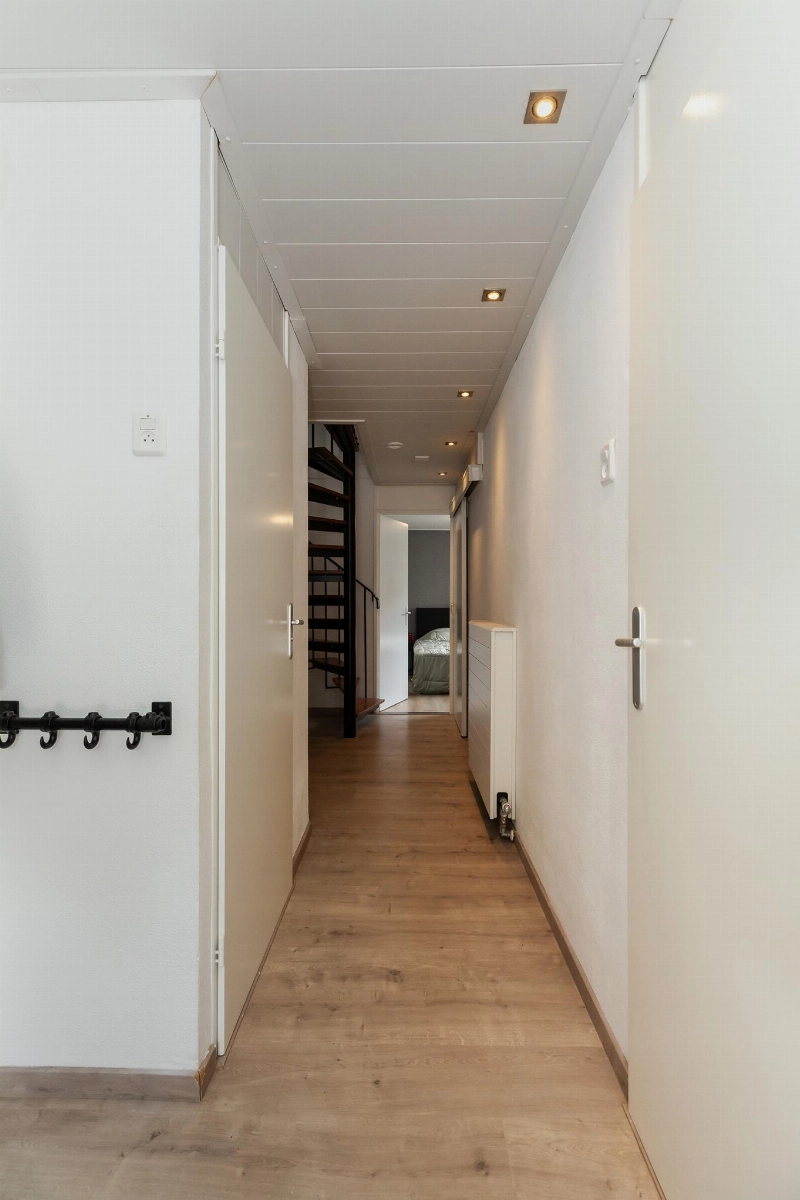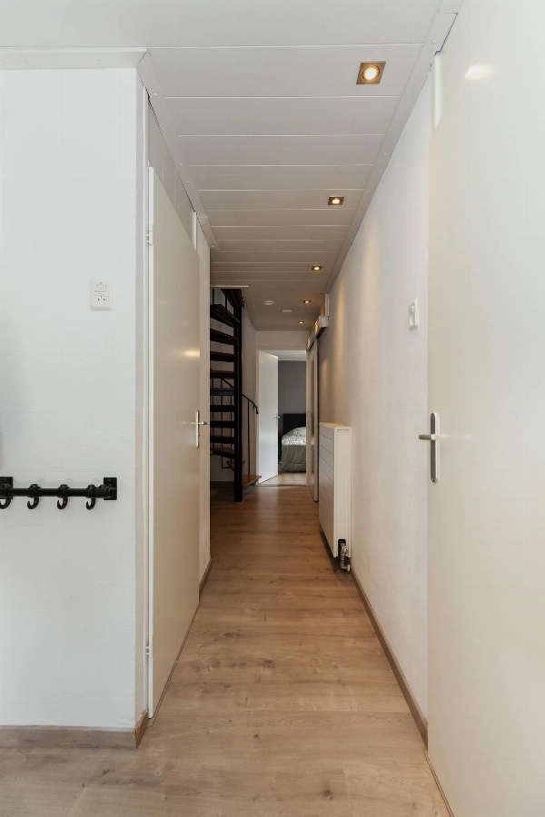 Entree, garderobe nis, meterkast met 8 groepen en dubbele aardlekschakelaar. Gang met lichte houtlook laminaatvloer, een verlaagd plafond met spotverlichting en een vaste kast met opstelling van de CV- combiketel (Remeha Avanta 2010).