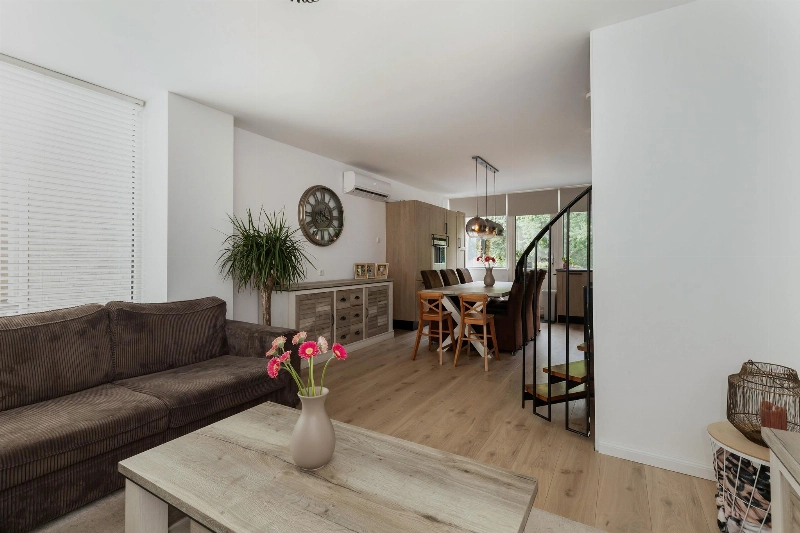 Ruime en lichte woonkamer met een houtlook laminaatvloer en een verlaagd plafond met spots. De muren en het plafond zijn gestuct en er hangt een airco die zowel kan koelen als verwarmen.