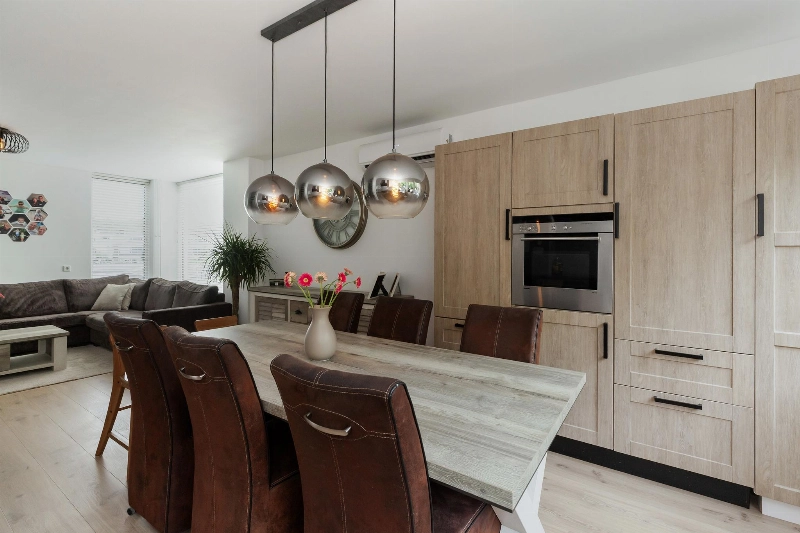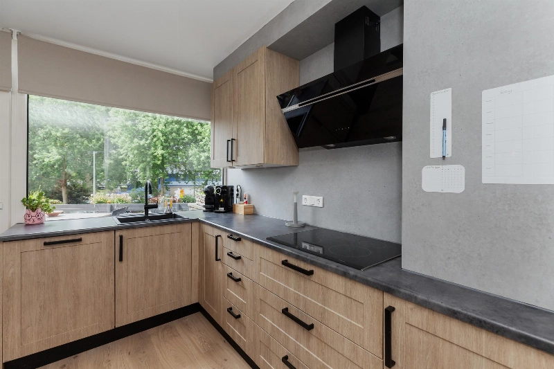 De woonkamer heeft een fijne zithoek met zijraam en een achterraam en aan de voorzijde bevindt zich een moderne keuken die in 2022 professioneel gewrapt is en voorzien van een nieuw aanrechtblad. Deze keuken is voorzien van een hoge wandopstelling en een lage opstelling en is voorzien van alle gemakken zoals: inductiekookplaat, een RVS afzuigkap, een koelkast met vriesvak, een vaatwasser en een combi-oven.