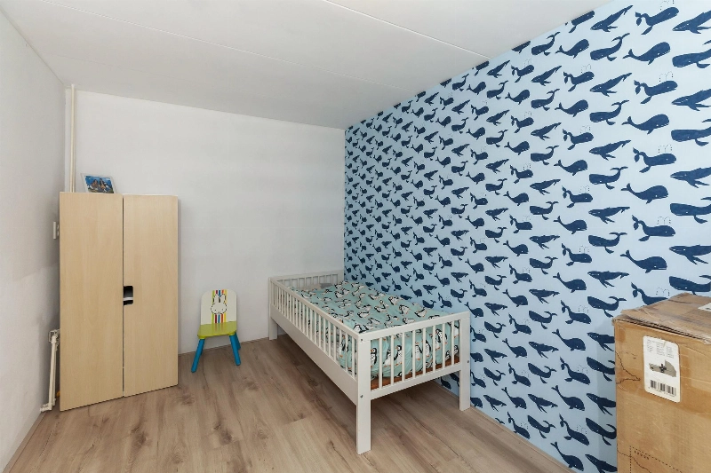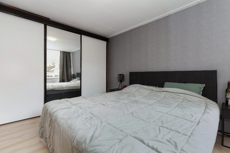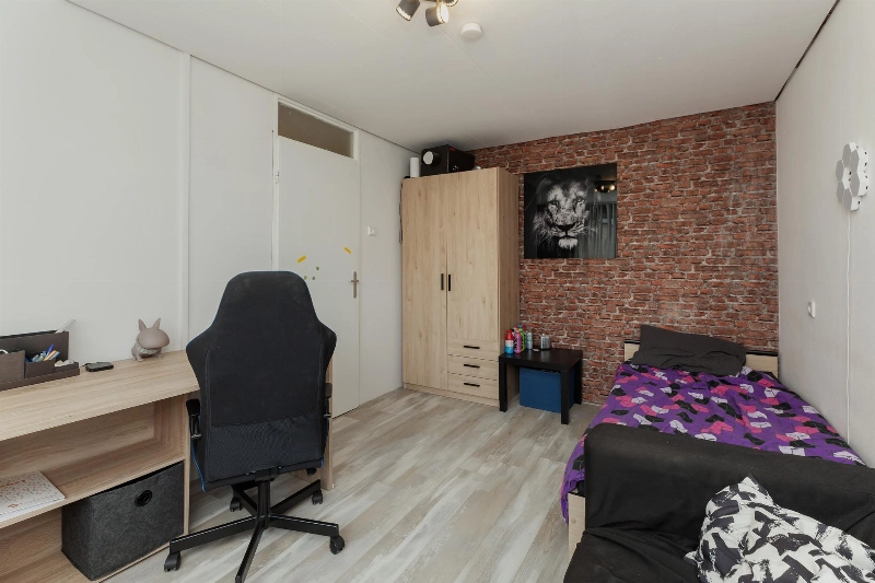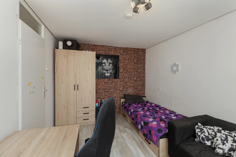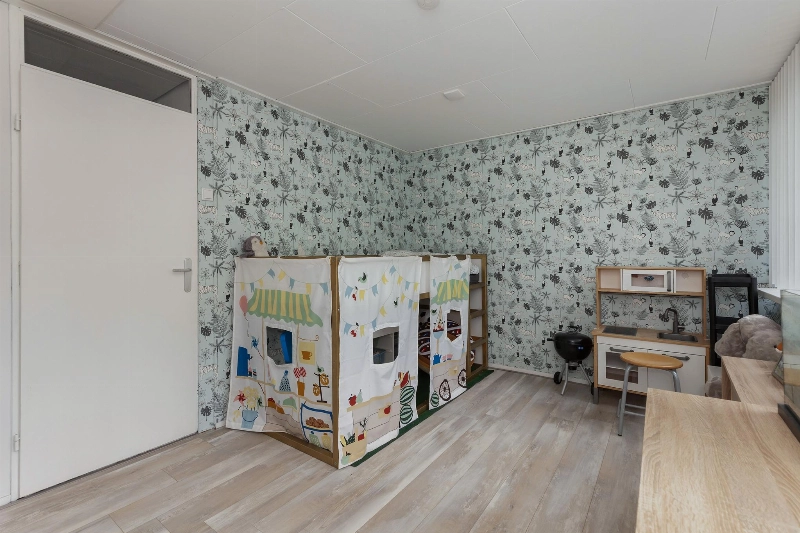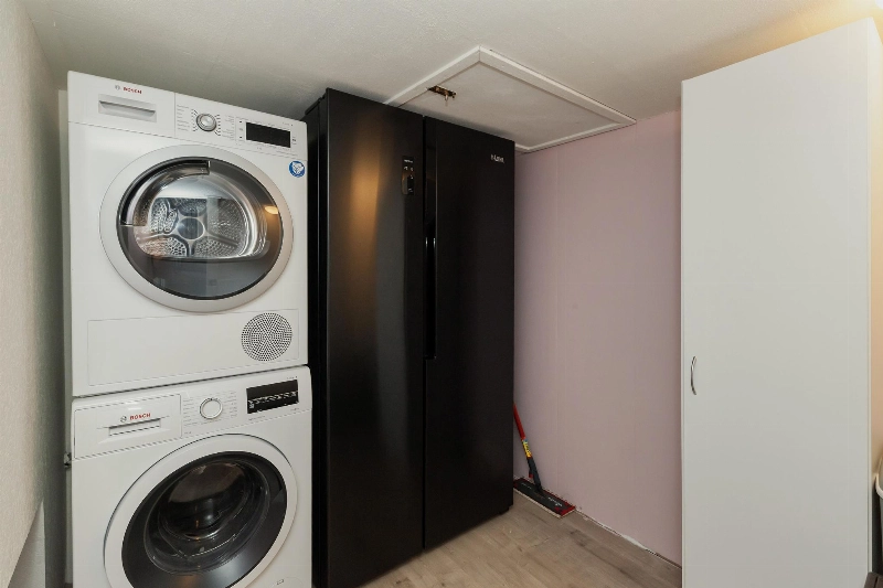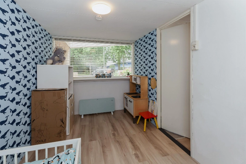 De garage is omgezet naar een slaapkamer aan de voorzijde. Deze kamer is thans in gebruik als slaapruimte maar is natuurlijk ook een heerlijke plek om thuis te werken! Via een schuifdeur in de gang bereik je een aparte berging met wasruimte én een extra opbergzolder.
