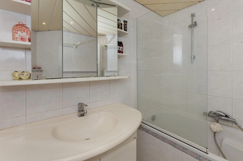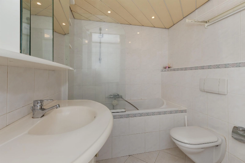 Ruime badkamer met crème/witte betegeling, een ligbad met douchescherm, een 2e toilet, een wastafelmeubel met spiegelkast, een hoekkast en een verlaagd plafond met spots en afzuiging.
