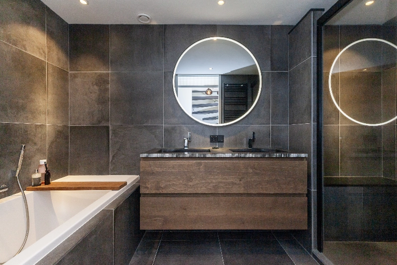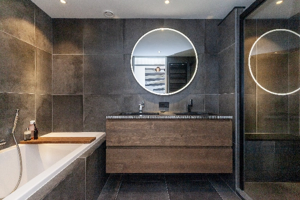 De prachtige badkamer is in 2021 vernieuwd en is voorzien van mooie antraciet betegeling, een ligbad, een ruime inloopdouche met glazen schuifdeur, een dubbel wastafelmeubel met een hardstenen blad, een spiegel met verlichting en verwarming, een handdoekradiator en spotverlichting in het plafond.