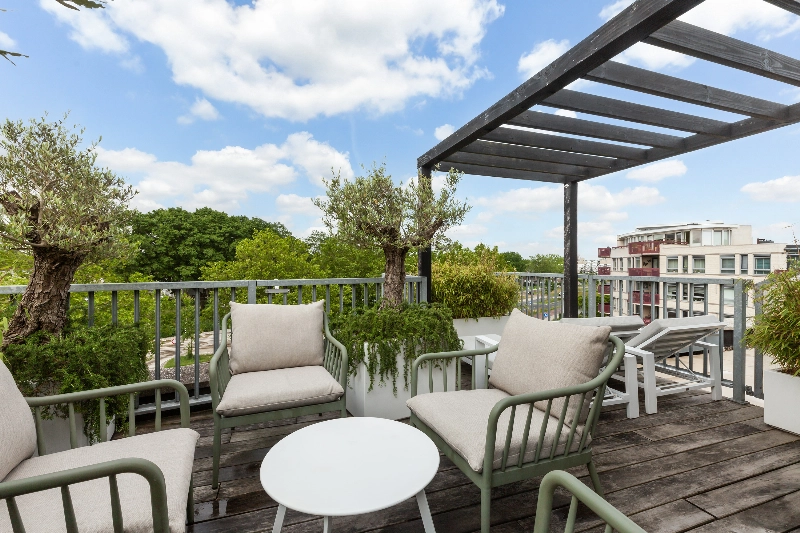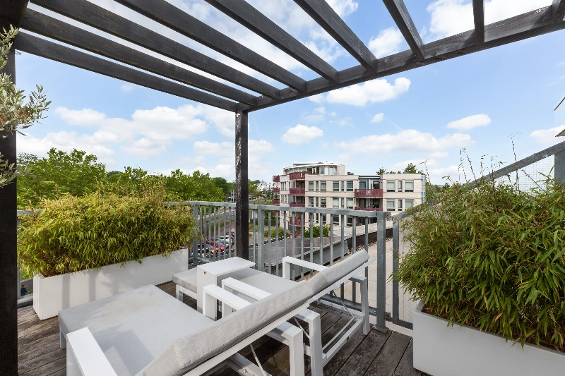 De 3e verdieping heeft een grote 4e slaapkamer met de opstelling van de c.v. ketel en de aansluitingen voor de wasmachine en droger. Via een deur is het zonnige dakterras te bereiken. Hier kan je in de zomer de hele dag van de zon genieten. Het terras is afgewerkt met bankirai terrasvlonders en mooie plantenbakken met een sproei installatie en verlichting. Deze plek is uitermate geschikt om in alle privacy van het buitenleven te genieten.