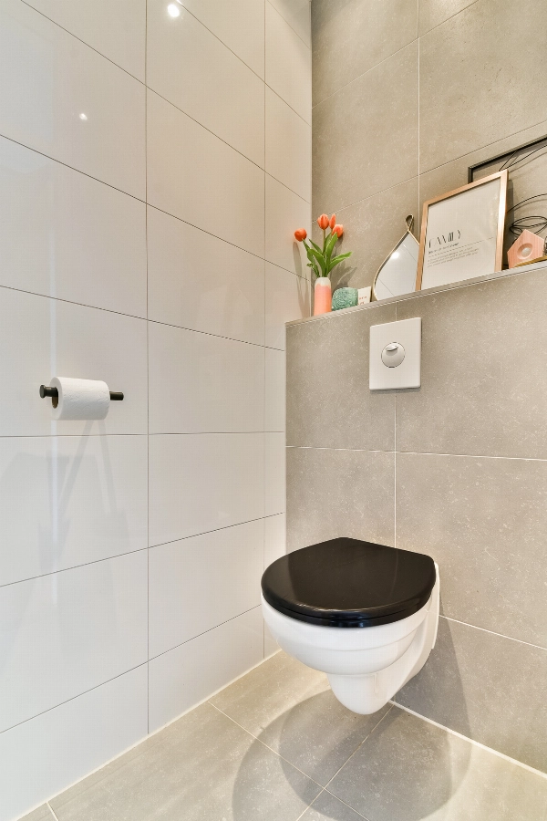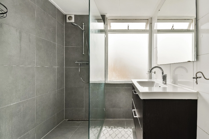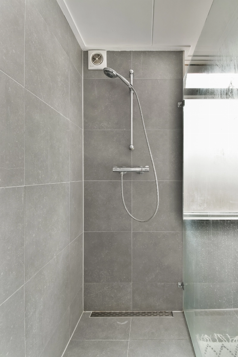 De moderne badkamer is afgewerkt met lichtgrijze vloertegels en een combinatie van witte en lichtgrijze wandtegels. De ruime inloopdouche is voorzien van een glazen wand. Daarnaast beschikt de badkamer over een zwevend toilet, een wastafelmeubel met lades en elektrische vloerverwarming.
