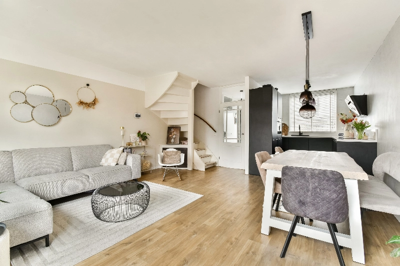 De woonkamer is strak afgewerkt met gestucte wanden, waarbij één wand is uitgevoerd in beton ciré voor een eigentijds accent. De houtlook laminaatvloer loopt door vanuit de hal naar de woonkamer en de open keuken, wat zorgt voor een mooi geheel.
