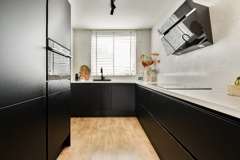 De moderne keuken (2021) heeft een mat zwarte opstelling met een wit composiet werkblad. De keuken is compleet uitgerust met een inductiekookplaat met afzuigkap (zwart glas), combi-oven, vaatwasser, koelkast en een Quooker.