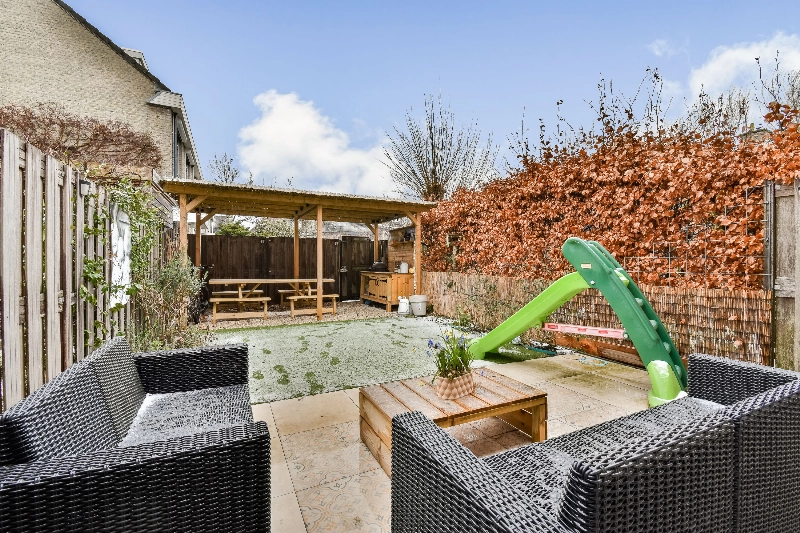Via de openslaande deuren bereikt u de sfeervolle, op het zuiden gelegen achtertuin. Hier vindt u een comfortabele loungehoek en een fraaie overkapping – de perfecte plek om te genieten van lange zomeravonden.
