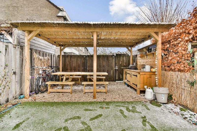 De zonnige achtertuin op het zuiden is een heerlijke plek om tot rust te komen. Onder de sfeervolle overkapping geniet u optimaal van lange zomeravonden en het buitenleven in alle comfort.