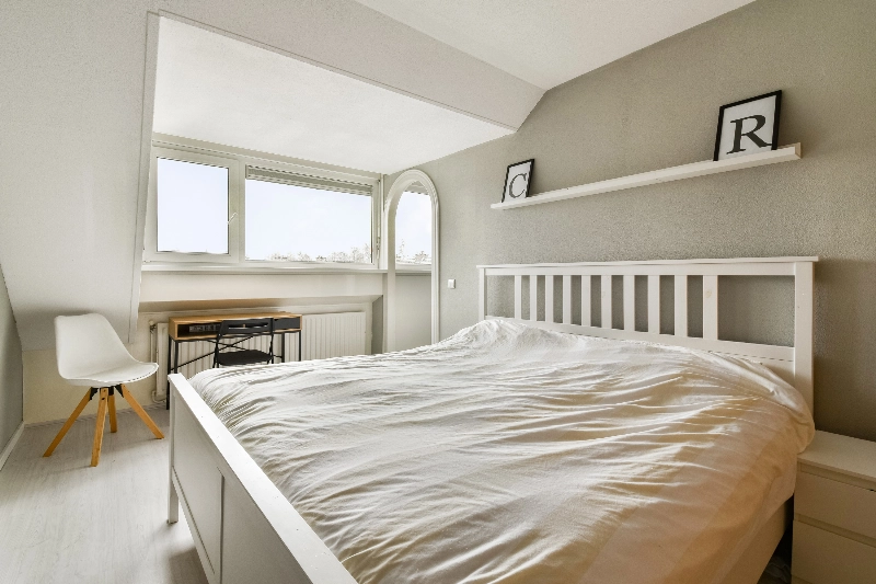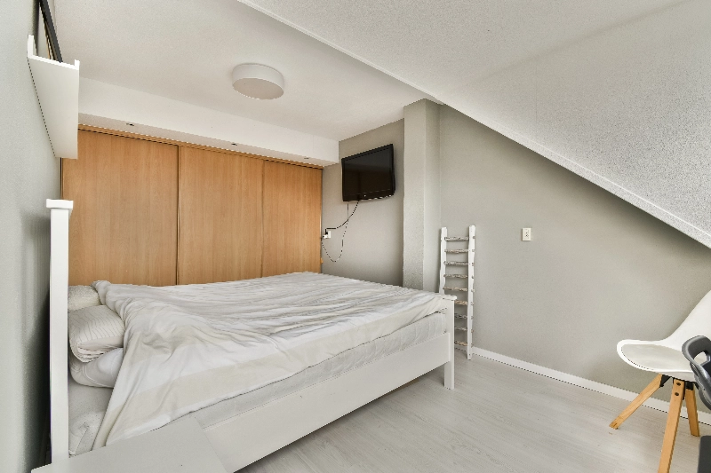 Slaapkamer IV is een royale zolderkamer met een kunststof dakkapel over de volledige breedte van de woning en een grote vaste schuifkast, wat zorgt voor veel lichtinval en praktische bergruimte.