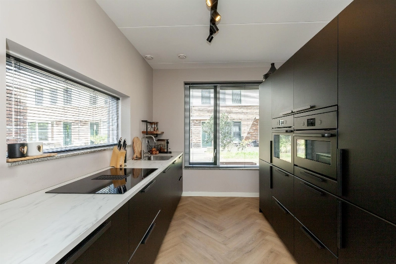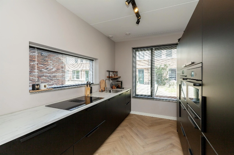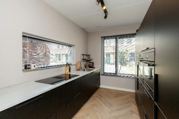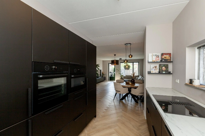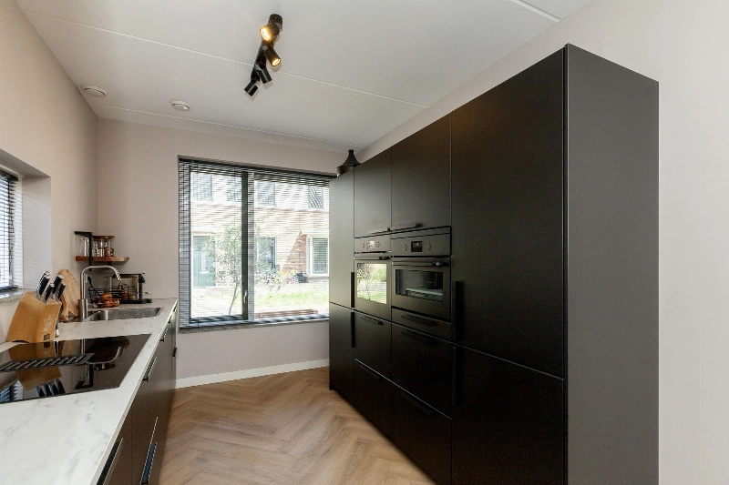 Aan de voorzijde van de woning bevindt zich de complete en moderne zwarte keukenopstelling met een hoge opstelling met vriezer, koelkast, oven, combimagnetron en onder het 2e zijraam staat de lage opstelling met marmerlook kunststof werkblad, spoelbak, vaatwasser, brede inductieplaat met geïntegreerde afzuiging en veel kastruimte. Via het keukenraam heb je zicht op het autovrije pad.