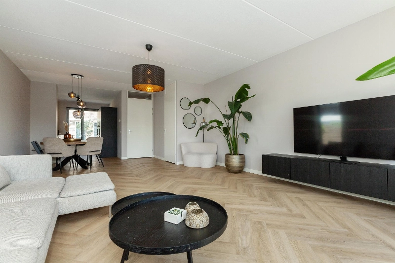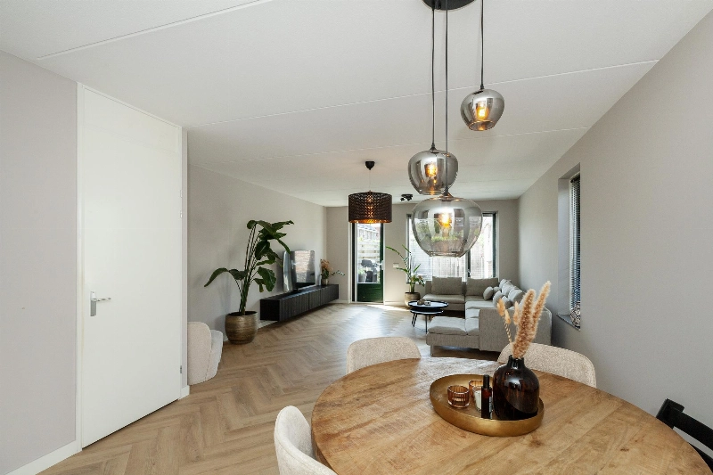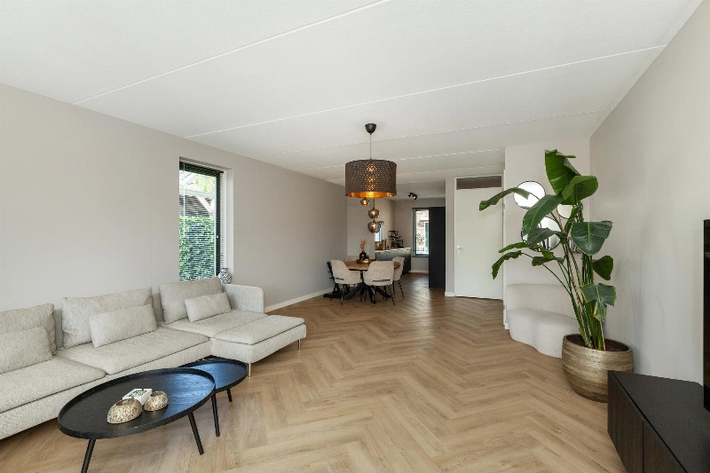 Nadat je je auto op je eigen parkeerplaats hebt geparkeerd, heb je middels de tuin of voortuin toegang tot de woning. De ruime entreehal is afgewerkt met een strakke PVC vloer die in visgraatmotief is gelegd en doorloopt naar de woonkamer. Hier vind je verder de geheel betegelde toiletruimte met hangend closet en fonteintje, de meterkast en de trapopgang naar de slaapverdieping. De woonkamer is door de uitbouw echt een ruime living! Hier heb je direct zicht op de fijne tuin en er is meer dan genoeg plek voor een grote hoekbank en eettafel! Het zijraam geeft een leuk en gezellig effect.