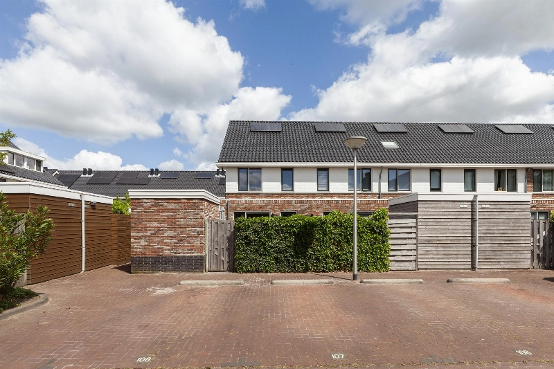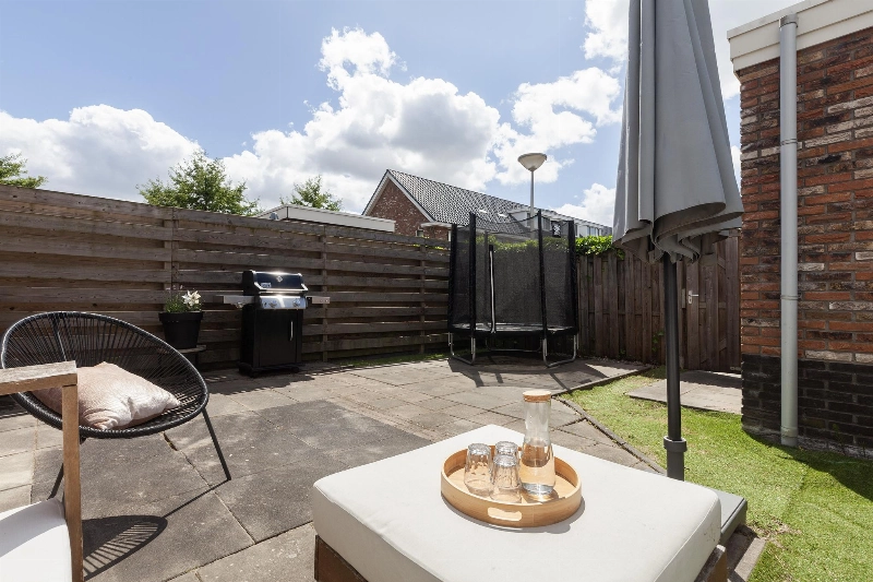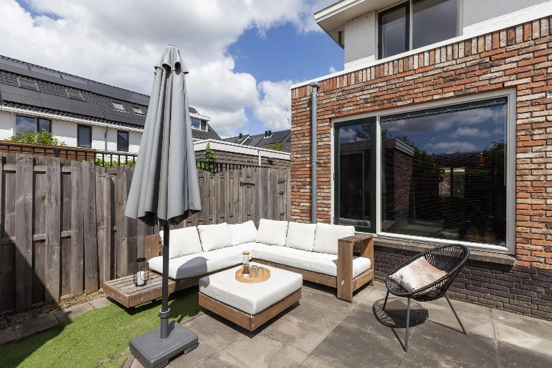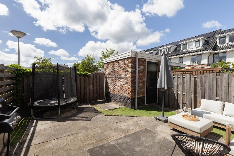 De achtertuin is door de hoekligging net even wat breder dan normaal in de wijk en is voorzien van een stenen berging. Een duurzaam hekwerk staat verstopt achter de schutting. Via de tuin bereik je op het mandelige terrein je eigen parkeerplaats. Zo hoef je nooit meer te zoeken naar een parkeerplek!