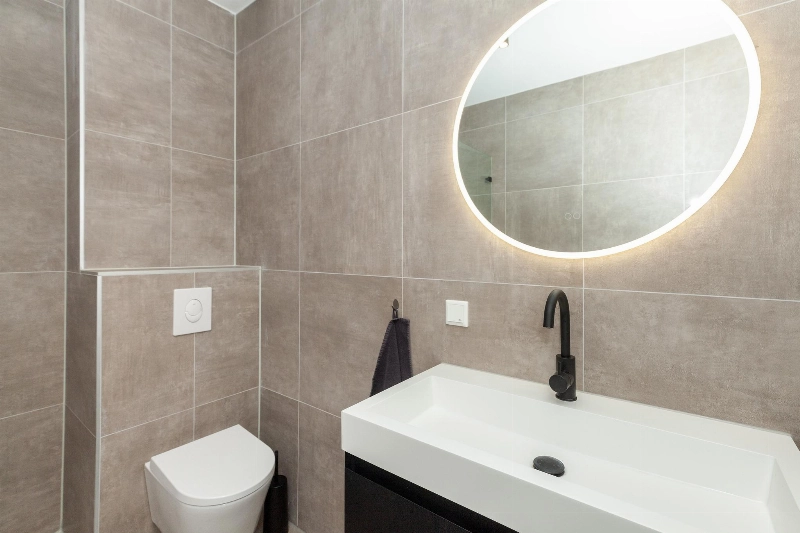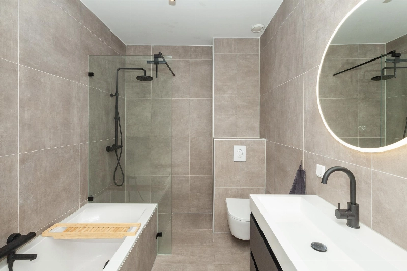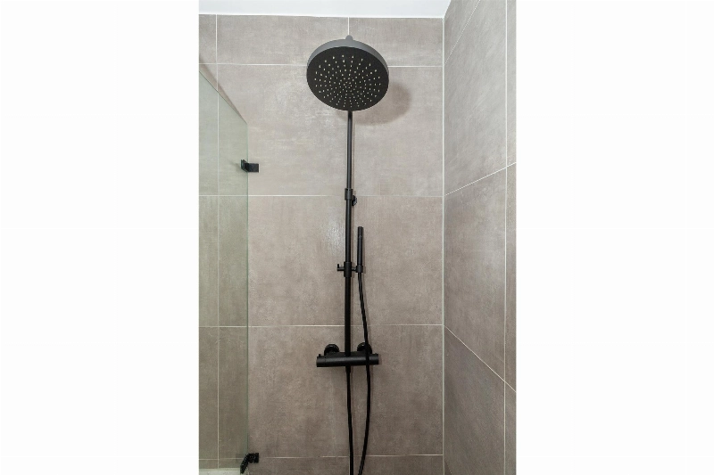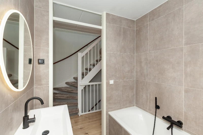 De moderne badkamer is in 2022 vernieuwd en voorzien van taupekleurige betegeling en is afgewerkt met een inloopdouche met glazen scherm, een ligbad, 2e toilet en een brede wastafel in meubel.