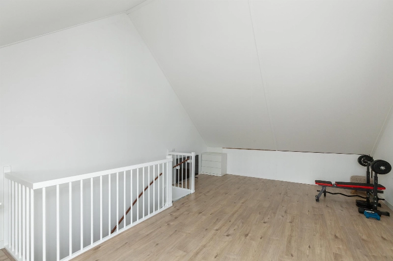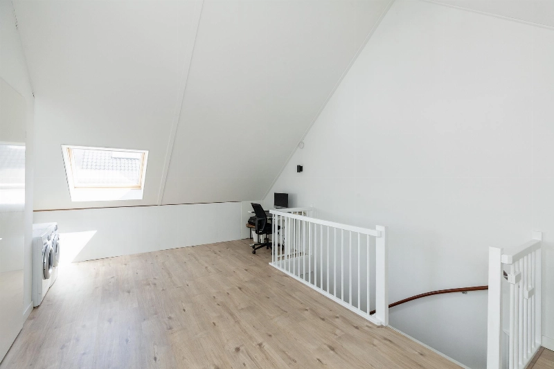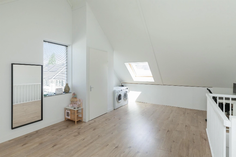 Deze zolderverdieping is thans één geweldig grote ruimte met gespoten dakafwerking, renovlieswanden en een laminaatvloer. Er is hier ook weer een zijraam en een dakraam aanwezig. Voldoende licht dus! Er is een aparte kast met de opstelling van de CV-combiketel (Intergas 2022), de mechanische ventilatie en omvormer voor de zonnepanelen. In de hoek van deze zolder is de opstelplaats voor de wasmachine en droger.