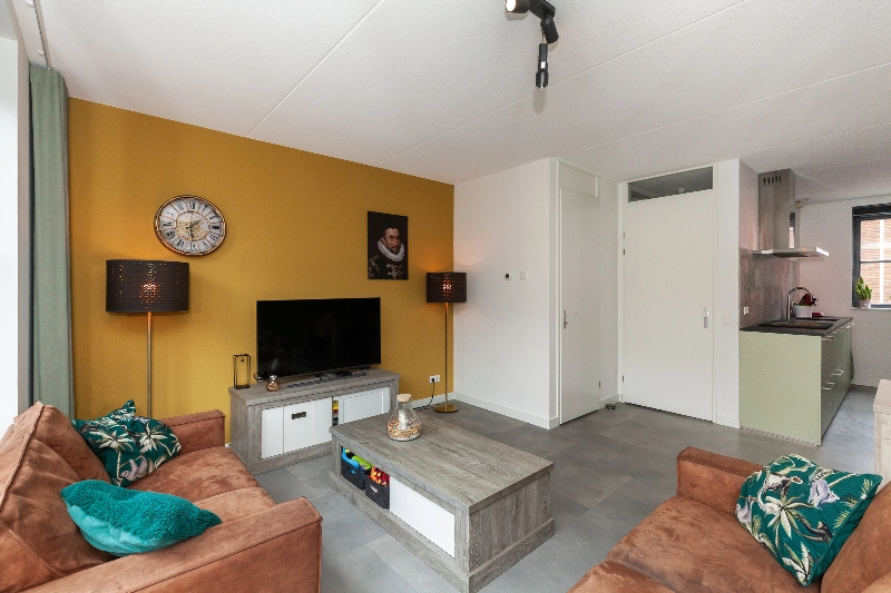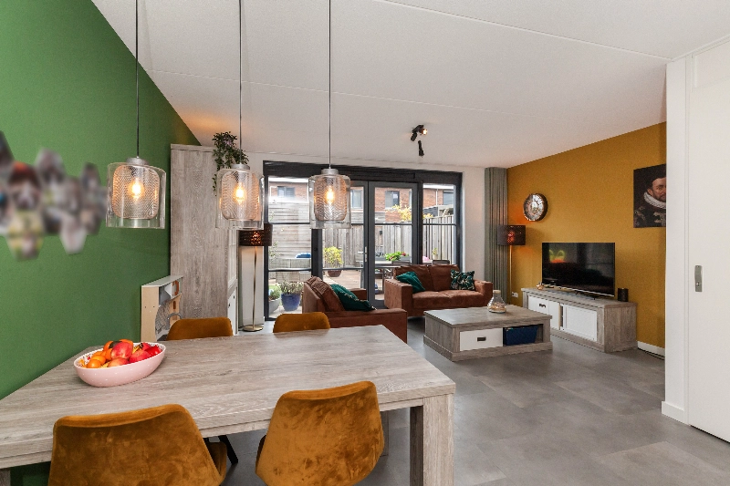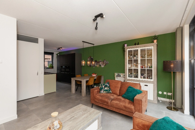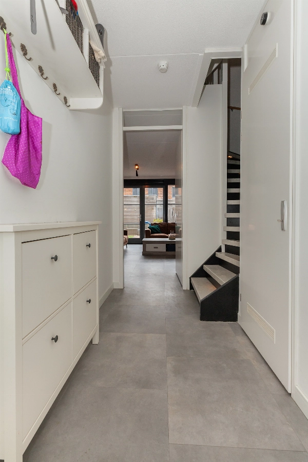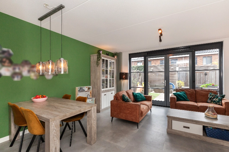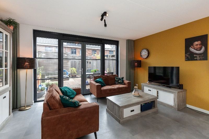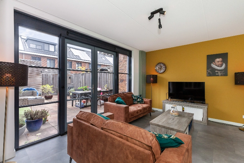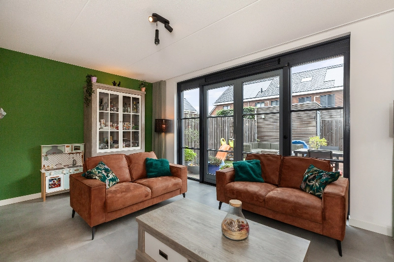 De woonkamer heeft een vaste trapkast en heeft een fijne zithoek met dubbele deur naar de tuin.