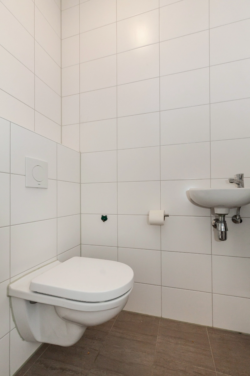 Entree van de woning, gang met meterkast en geheel betegelde toiletruimte met witte wand- en cappuccino vloertegels en een zwevend closet.