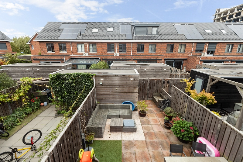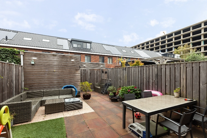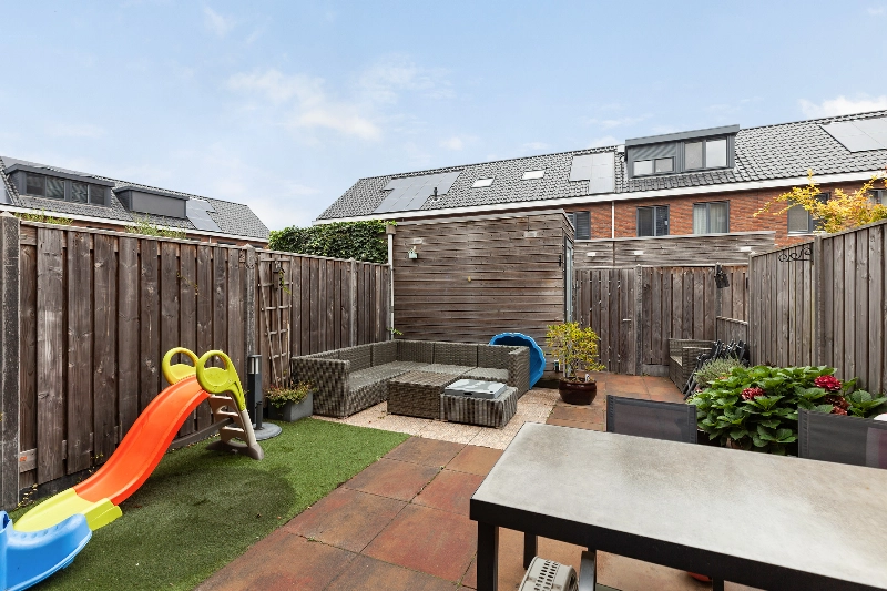 De tuin is keurig bestraat en voorzien van houten schuttingen, een houten berging en een achterom naar de steeg.