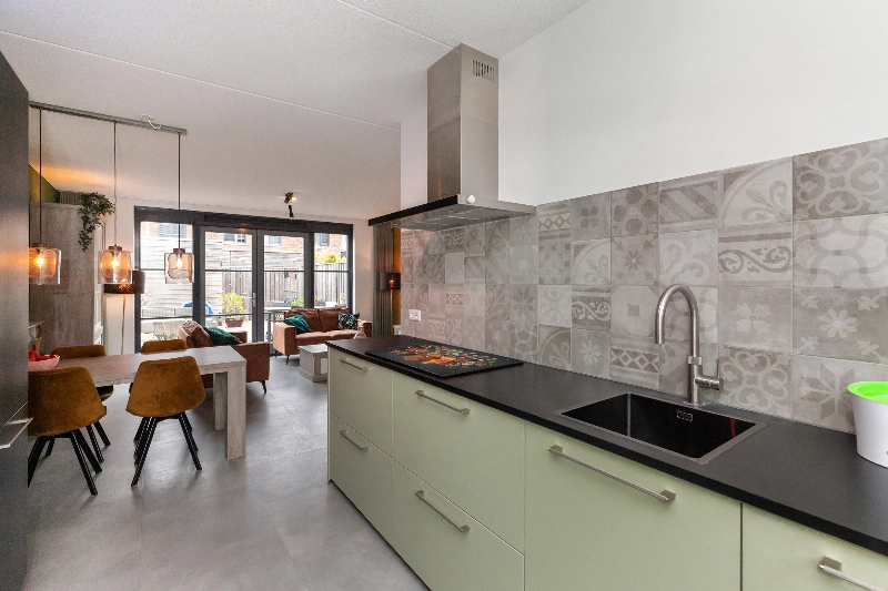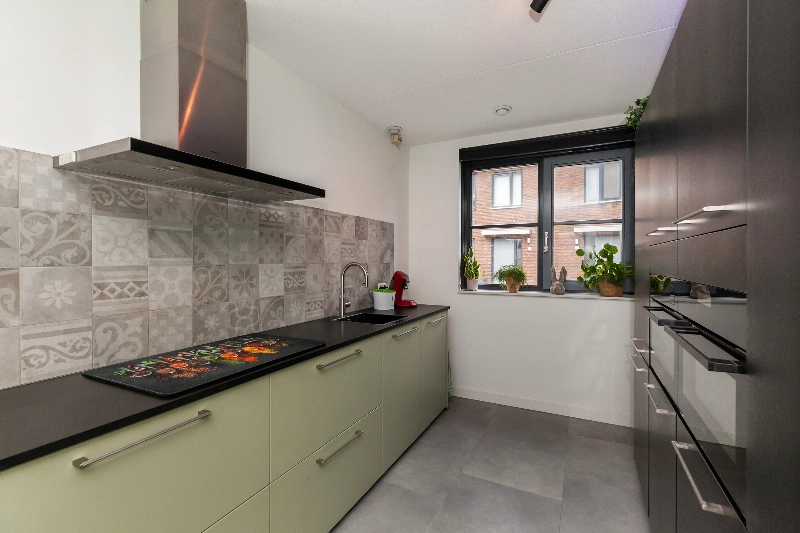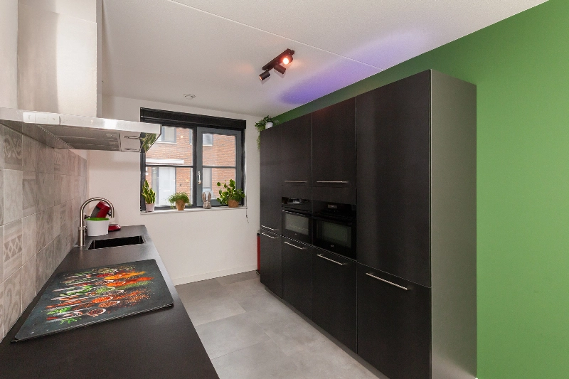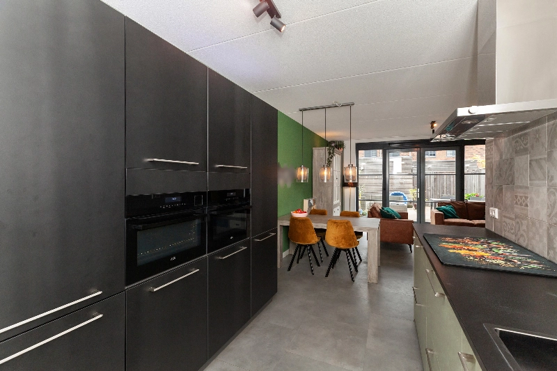 We gaan weer naar binnen en lopen via de woonkamer naar de open keuken aan de voorzijde. Wow.... wat een mooi plaatje! Zo is er een olijfkleurige rechte opstelling voorzien van inductie kookplaat, afzuigkap, vaatwasser, kunststof werkblad en achterwandbetegeling. De hoge opstelling is in zwart uitgevoerd en voorzien van een koelkast, vriezer, combi-stoomoven, een combimagnetron en veel opbergruimte.