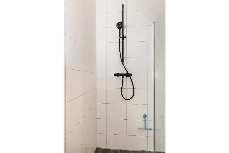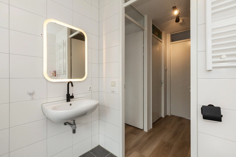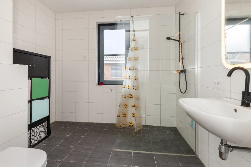 De ruime badkamer is modern betegeld met witte wand- en grijze vloertegels, een inloopdouche, 2e toilet, wastafel met daarboven een spiegel met verlichting.