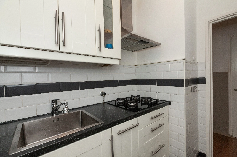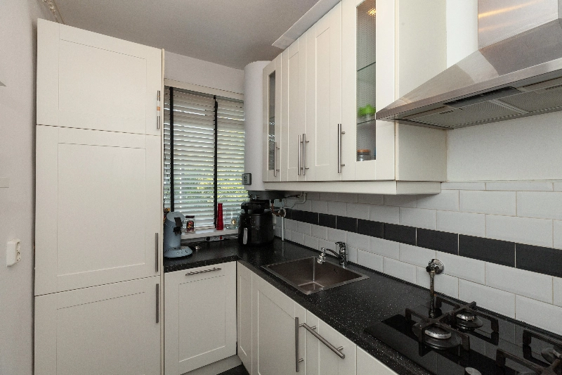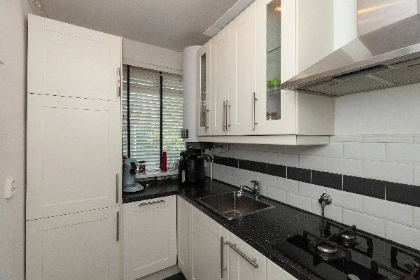 De moderne keuken is uitgevoerd in het crème met een zwart werkblad en uitgerust met een 4 pits gas op glaskookplaat, een RVS afzuigkap, een vaatwasser, een vriezer, een koelkast en een oven. Tevens bevindt zich in de keuken de opstelling van de huurboiler.