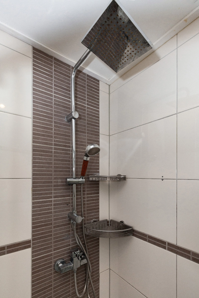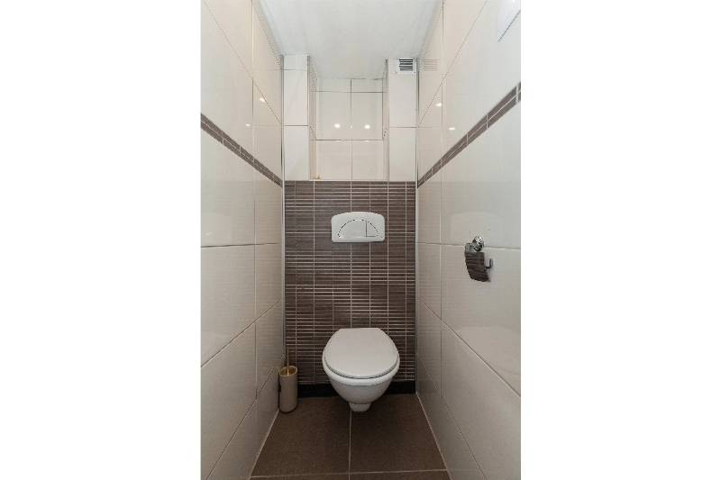 Verder beschikt het appartement over een moderne toiletruimte, volledig betegeld in lichte tinten, met een zwevend toilet. De badkamer is in dezelfde kleurstelling uitgevoerd en uitgerust met een halfronde douchecabine, een wastafelmeubel met spiegel en de aansluiting voor de wasmachine.