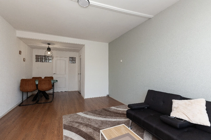 De woonkamer is heerlijk licht dankzij de grote raampartij en biedt een levendig uitzicht over de omgeving. De wanden zijn voorzien van spachtelputz en de gehele woning is voorzien van een stijlvolle houtlook laminaatvloer.