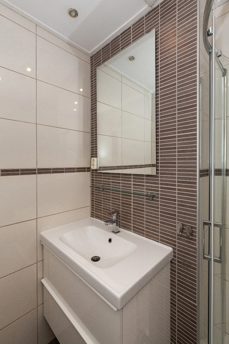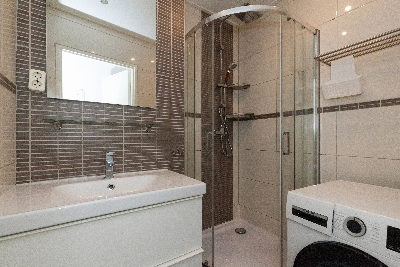 De moderne badkamer is in dezelfde kleurstelling als het toilet uitgevoerd en heeft een halfronde douchecabine, een wastafelmeubel met spiegel en de aansluiting voor de wasmachine.